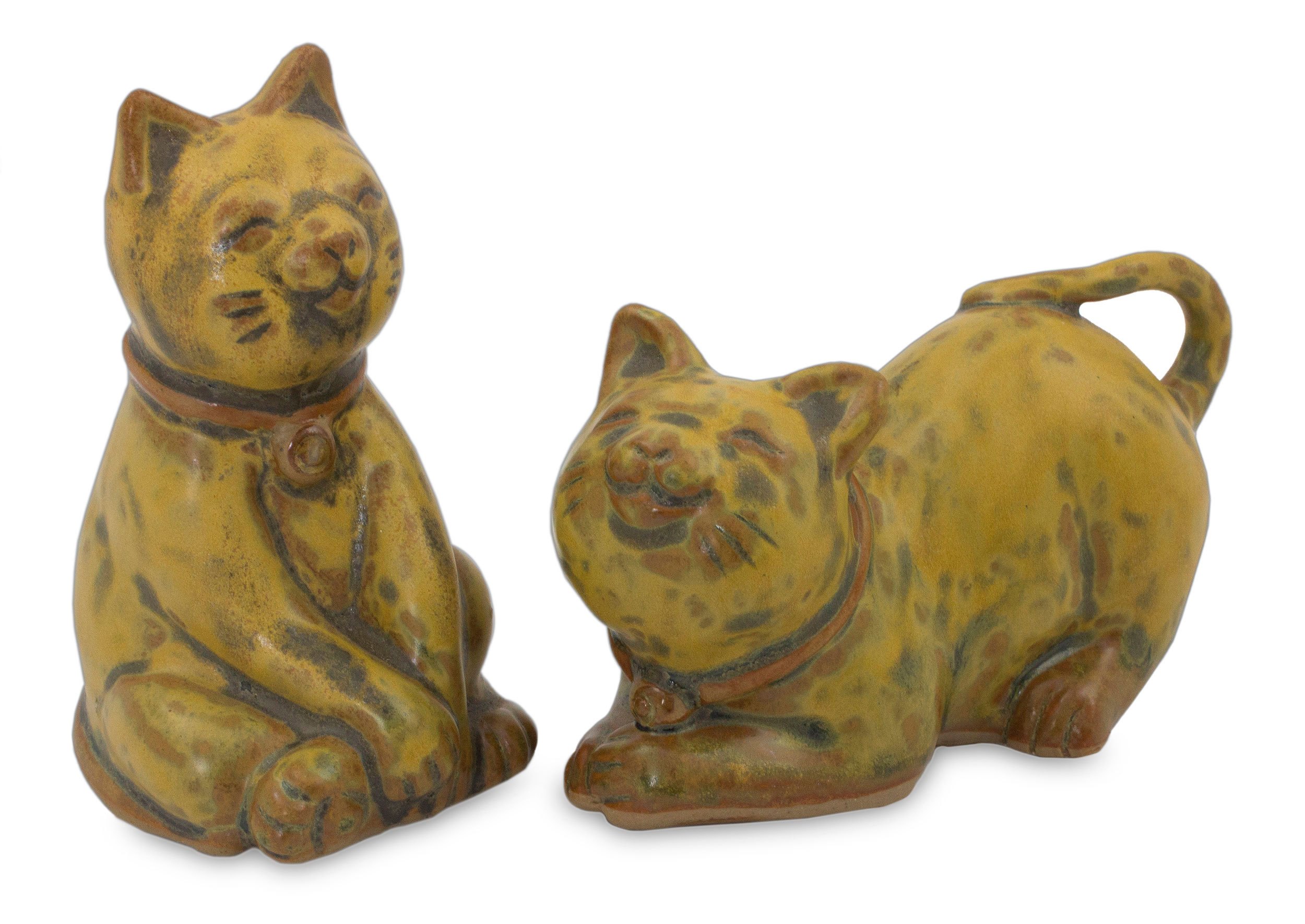 Handcrafted Yellow Ceramic Cats from Thailand (pair), 'Kitten Sisters'