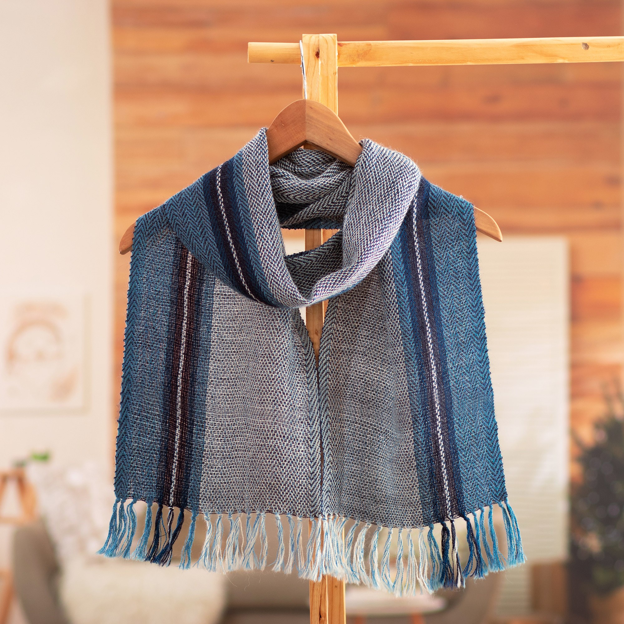 Handloomed 100% Alpaca Scarf in Blue and Turquoise Hues, 'Blue Visions'