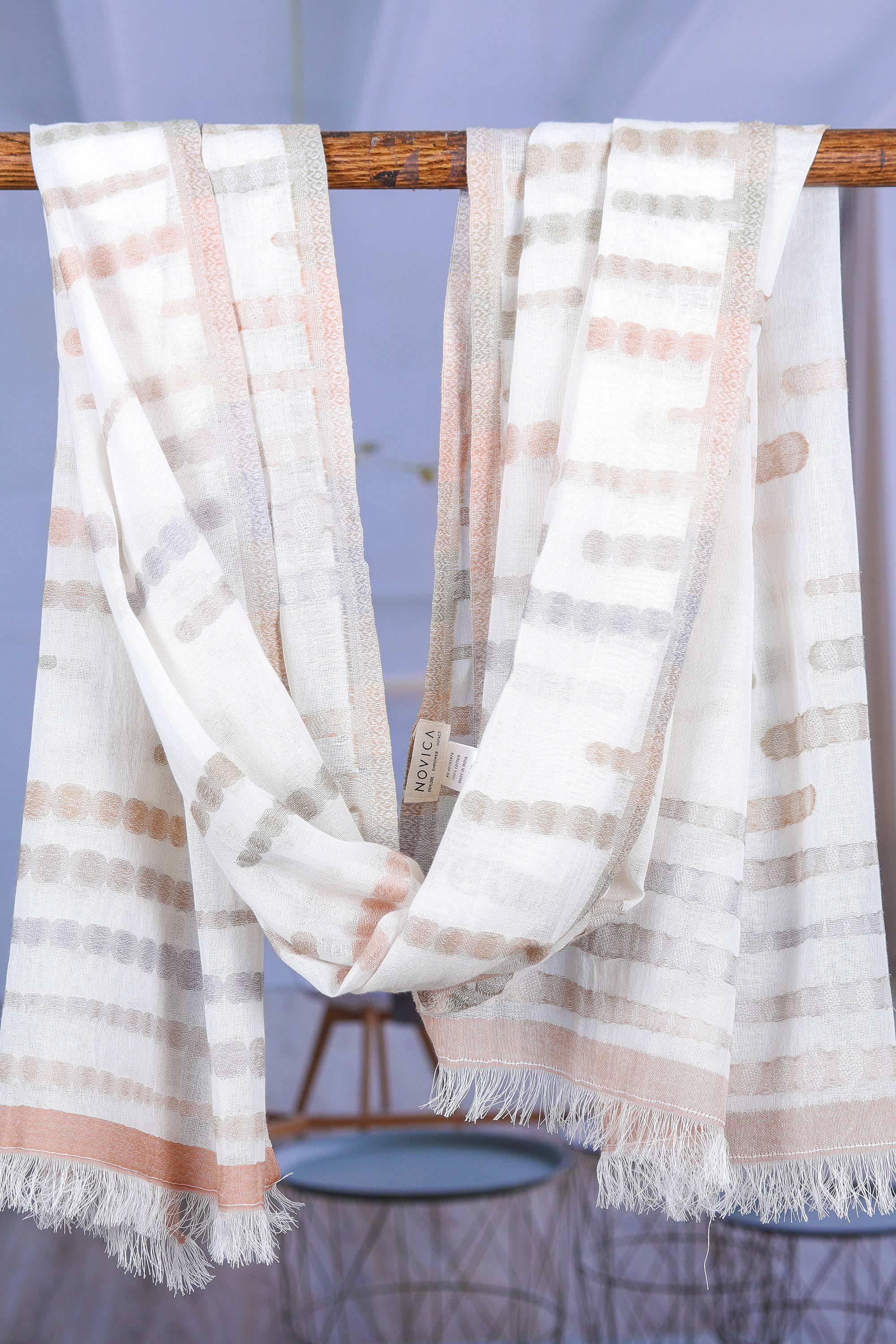 Handloomed Grey and Beige Cotton Shawl with Ivory Base Hue, 'Beige Shadows'