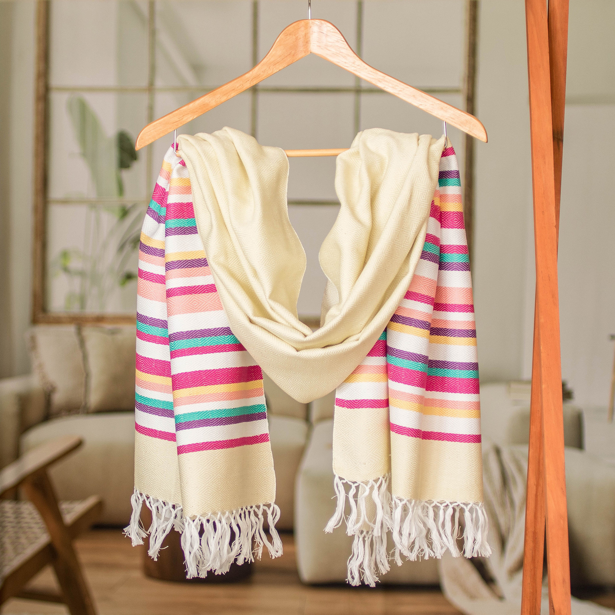 Handloomed Ivory Cotton Shawl with Colorful Stripes, 'Dulcet Aurora'