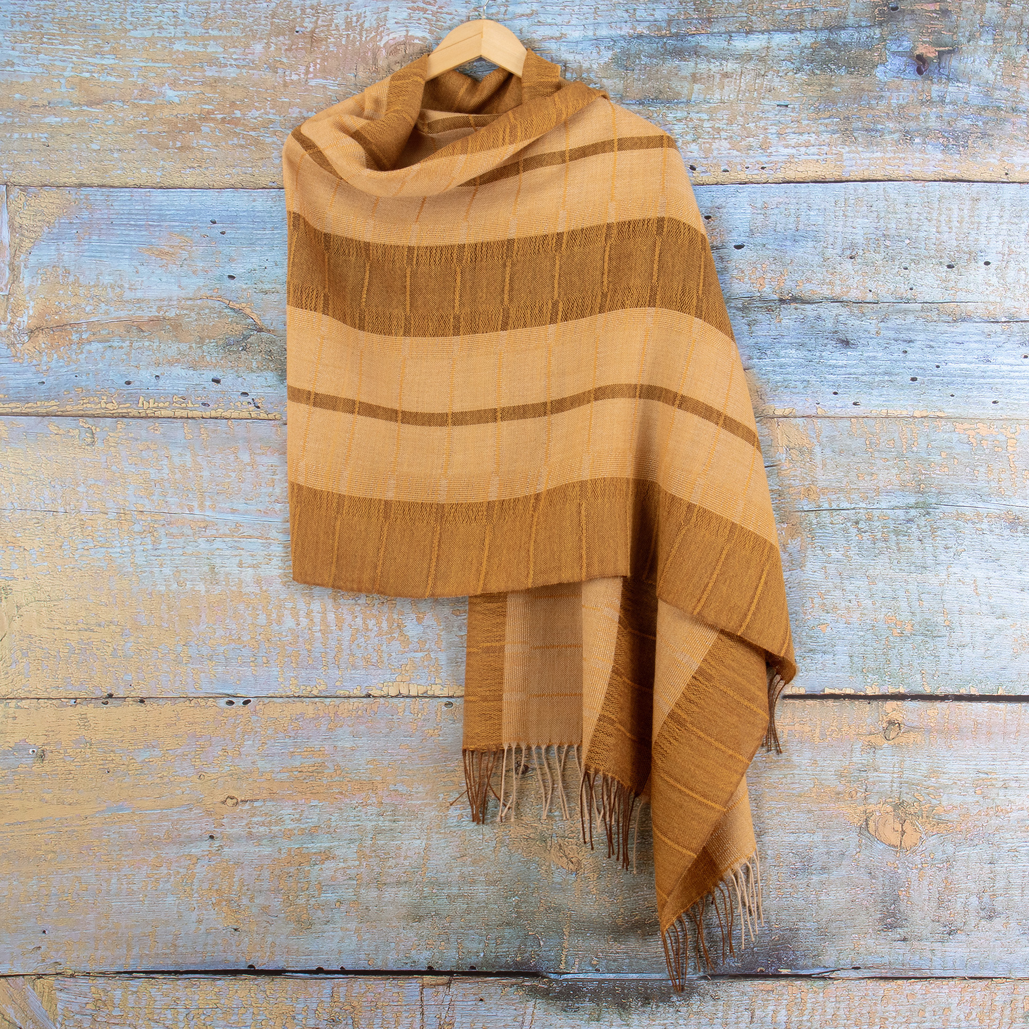 The majesty of the Andean textiles is displayed in this refined creation by master artisan Wilmer Vilchez. Loomed in Peru, this high-quality piece is crafted from soft baby alpaca yarns in a palette of brown, yellow and beige hues, making the shawl ideal for any ensemble. In addition to its stylish striped pattern, the design is also complemented with fringes for an elegant look.