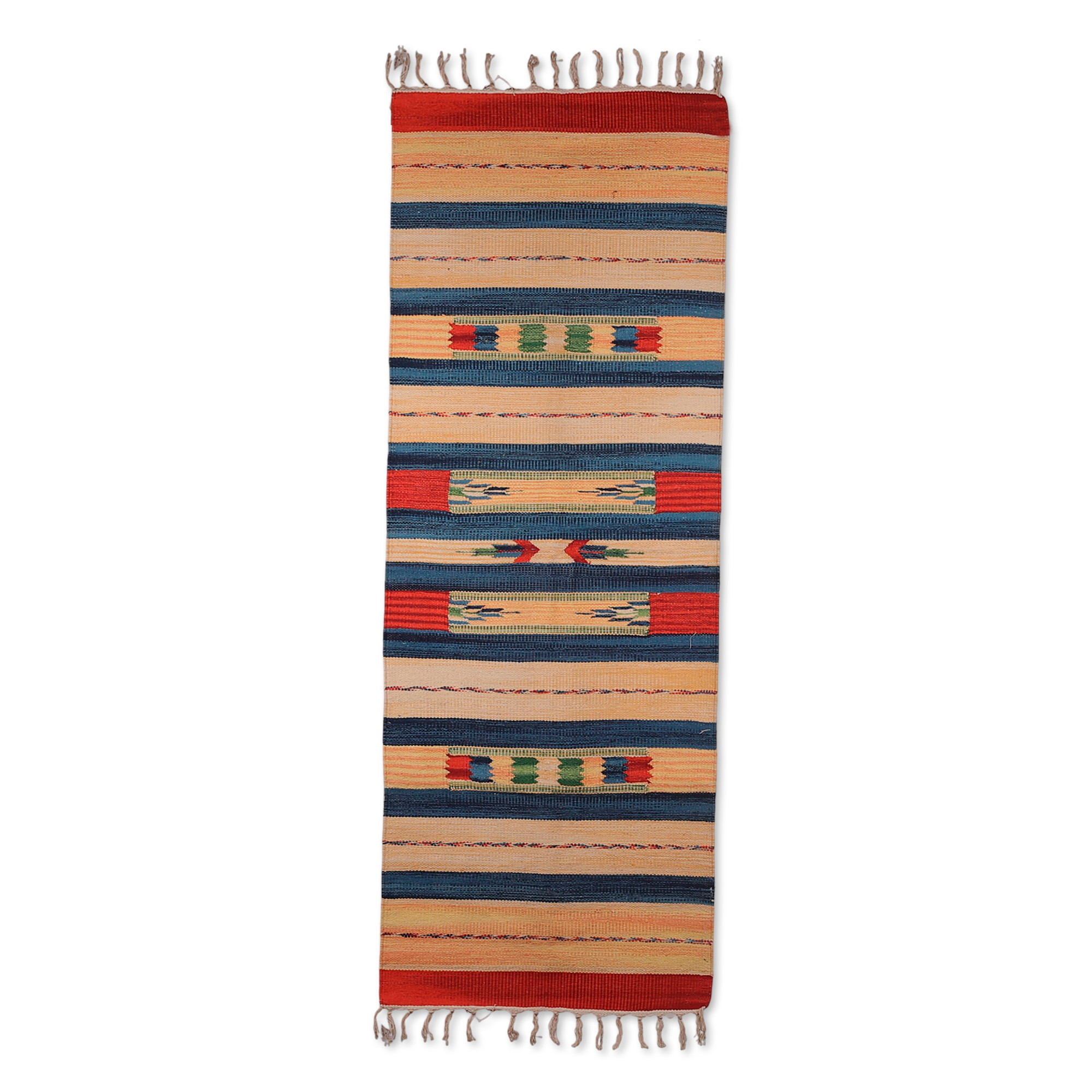 Handloomed Striped 2x5 100% Cotton Dhurrie Rug with Fringed, 'Morning Wonders'