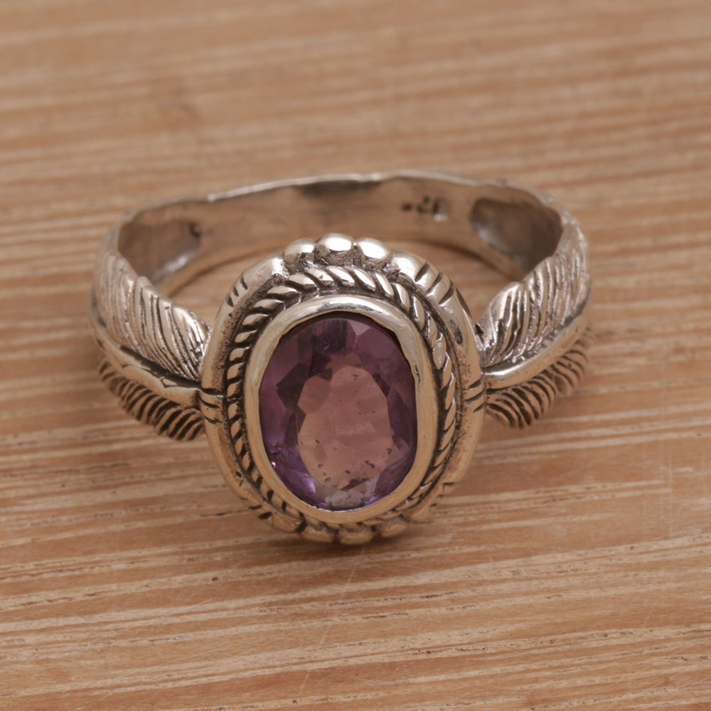This unique cocktail ring features an intricately hand engraved sterling silver band in the shape of two feathers. At the center of the band sits a one-carat amethyst gemstone in the middle of a carved motif setting. Indonesian artisan Komang Suastra individually designs and crafts each ring for a truly unique piece of jewelry.