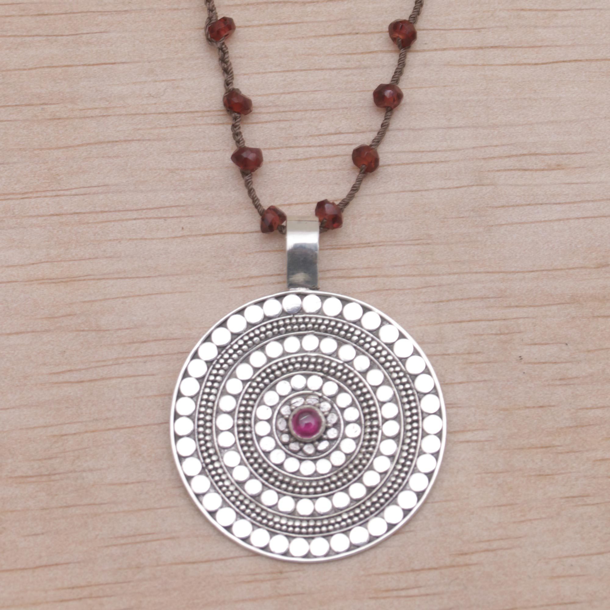 Ketut Sulastri crafts this luminous pendant necklace in 925 sterling silver. The Balinese artisan braids a brown nylon cord studded with garnets as the host for a dramatic centerpiece pendant with rhodolite. A larger garnet bead adorns the silver clasp.