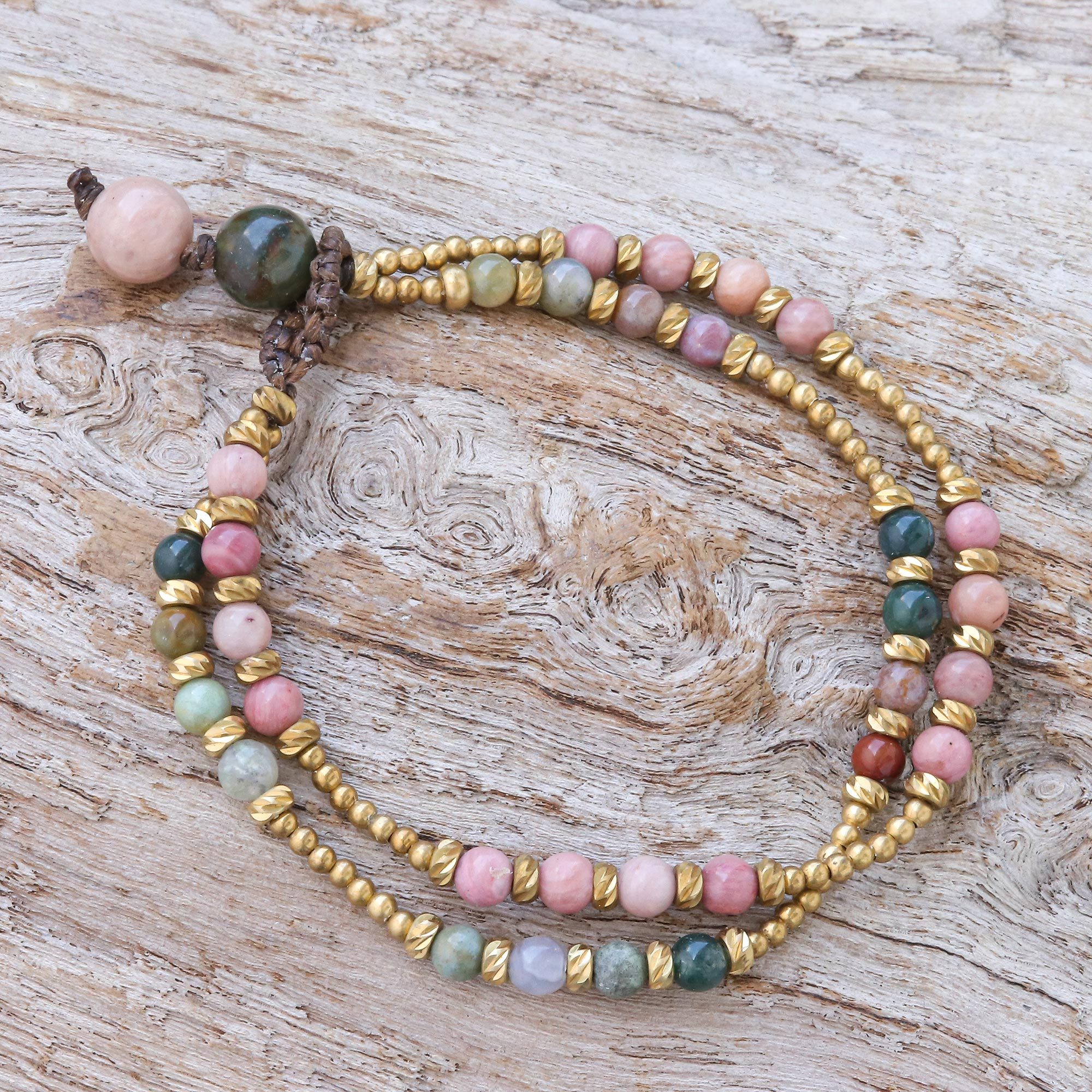 Handmade Agate and Brass Beaded Bracelet, 'Carnival in Pink'