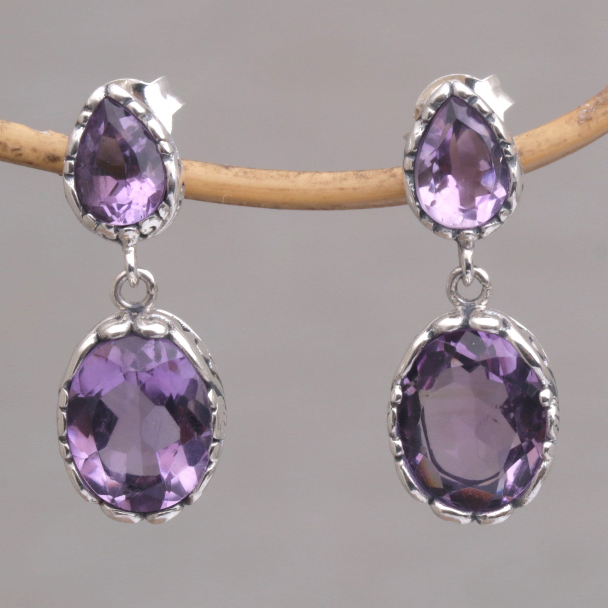 Komang Wijayana presents this sophisticated pair of dangle earrings with over three carats of beautiful faceted amethyst gemstones. He works with local artisans who craft each earring by hand from sterling silver. Each earring features a pear-shaped amethyst and an oval amethyst that glisten from within bezel settings. An oxidization technique is used to enhance the motif of swirls seen on the sides of the earrings, which accentuates their beauty.
