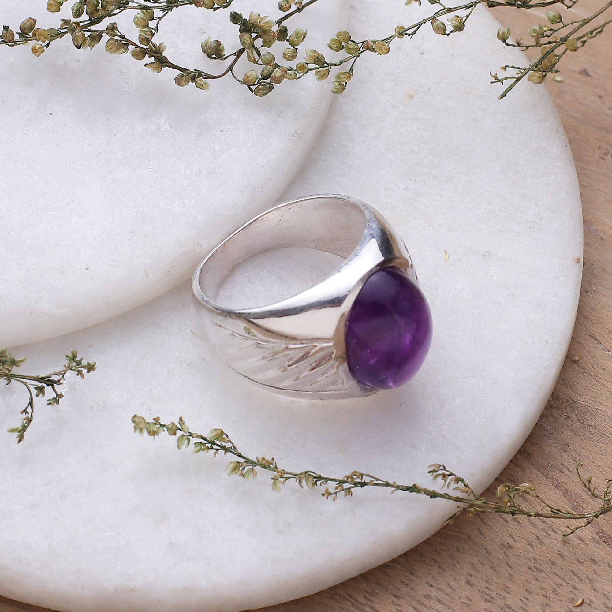 This handsome domed ring comes from creative Indian designer Alok Jain. A single cabochon of amethyst sits nestled within a sterling silver bezel setting, with an attractive motif of slanted lines adorning either side of the stone. The ring is expertly crafted by hand, with oxidization enhancing the captivating design.