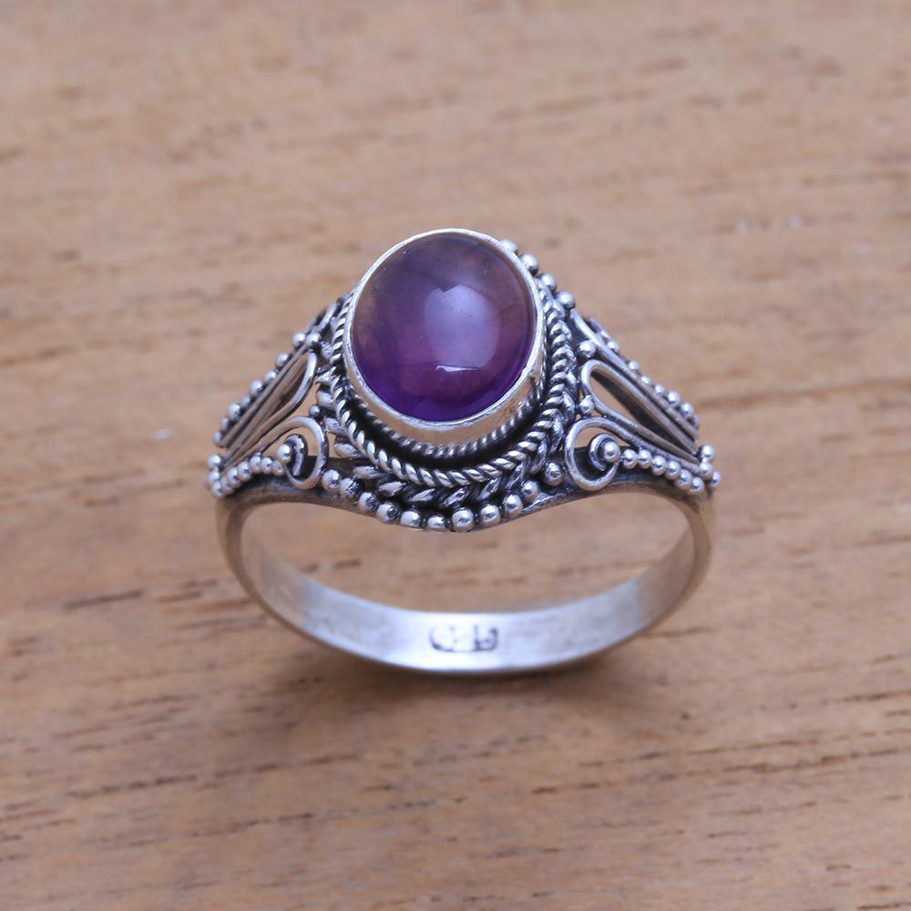 Possessing a regal beauty, this single-stone ring from Bali showcases an oval cabochon of purple amethyst. Ketut Sulastri designs the ring, which is handcrafted with dot, rope, and wire motifs in sterling silver.