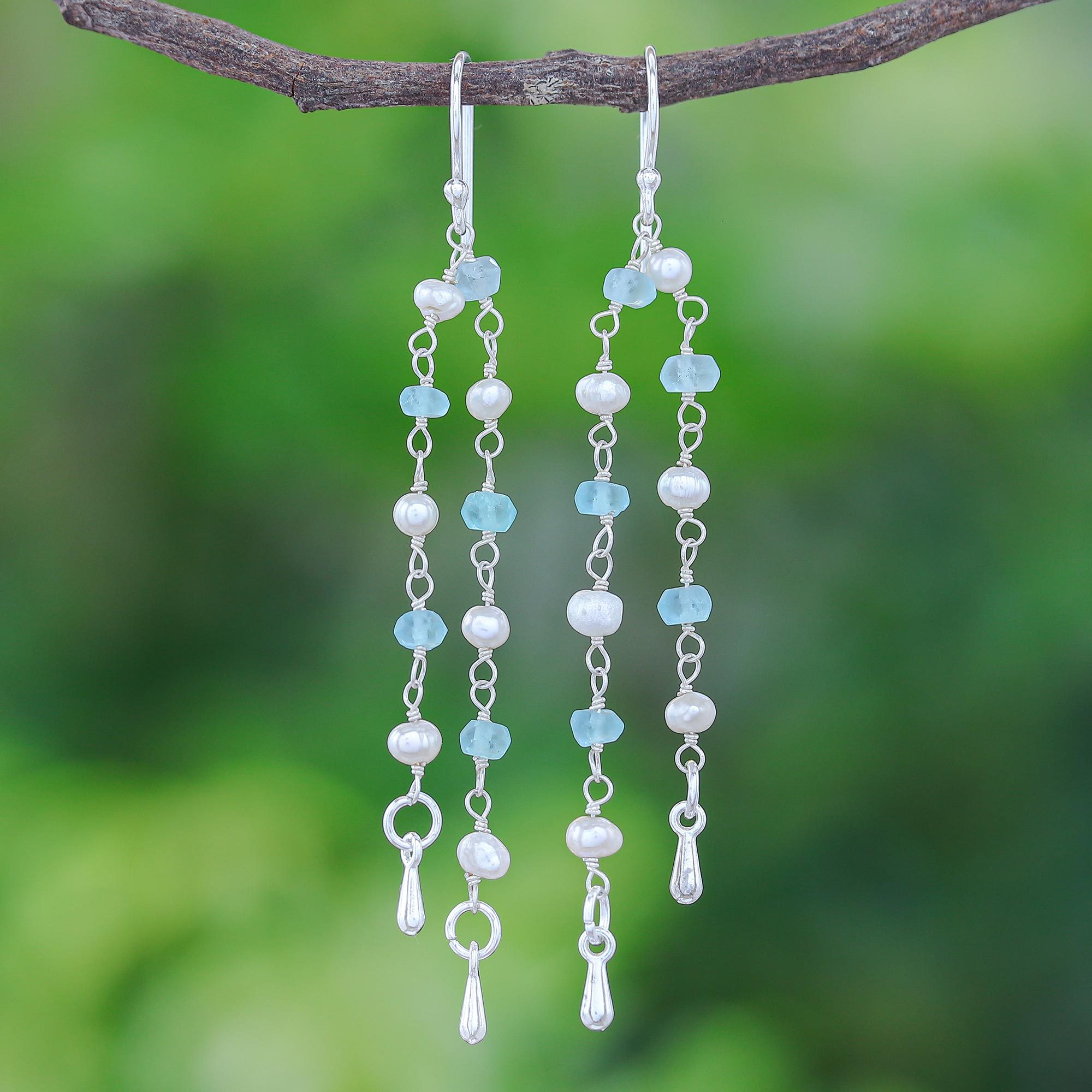 Beads of natural blue apatite alternate with lustrous white pearls in this delicate and radiant pair of sterling silver dangle earrings. Matta of Thailand presents this beautiful pair of earrings perfect for any outfit.