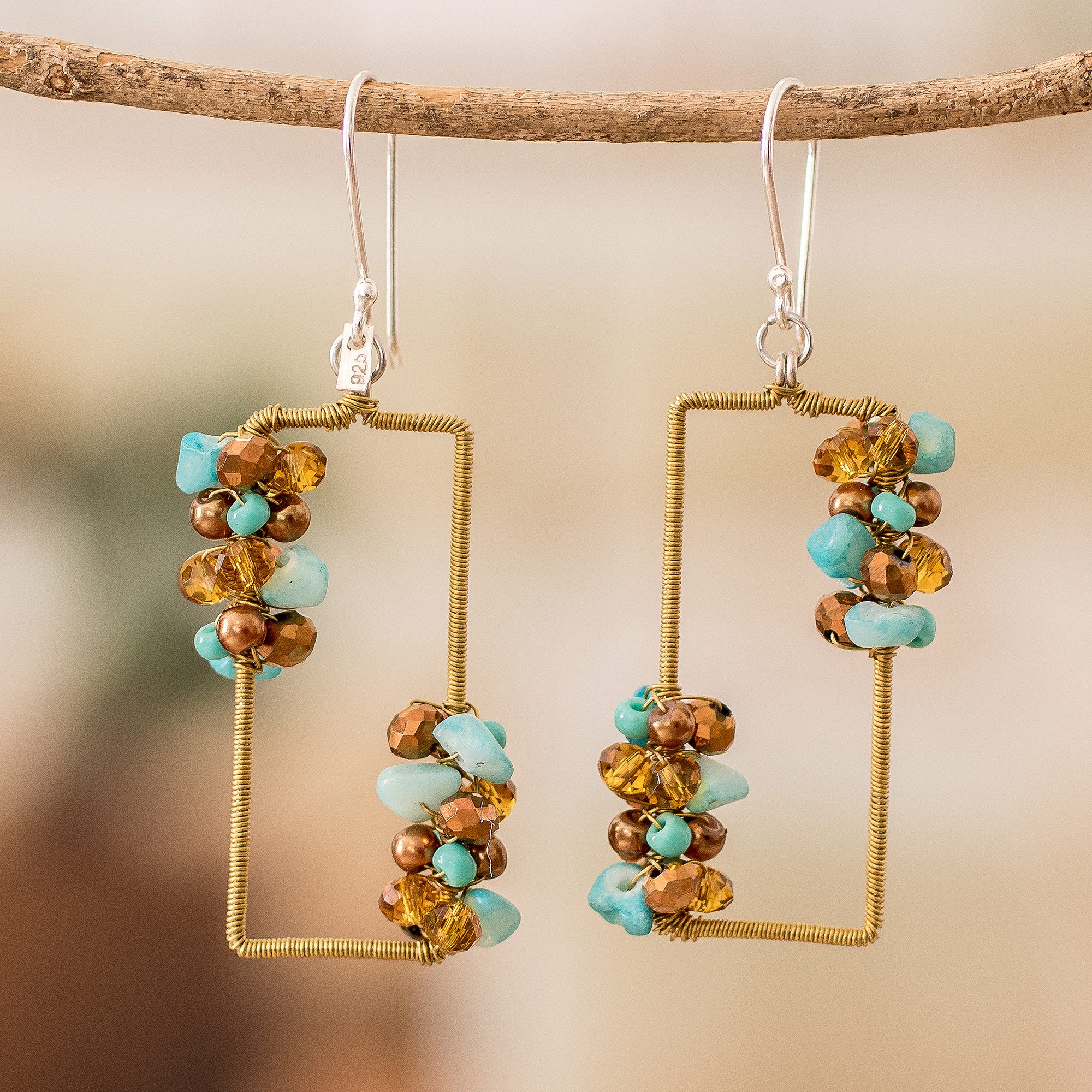 Precious aquamarine stones and petite crystal and glass beads masterfully decorate the corners of these rectangular dangle earrings in refreshing aqua and golden hues. Guatemala's Domingo Reanda masterfully handcrafts these irresistible accessories with stainless steel wire and finishes them with gleaming sterling silver hooks.