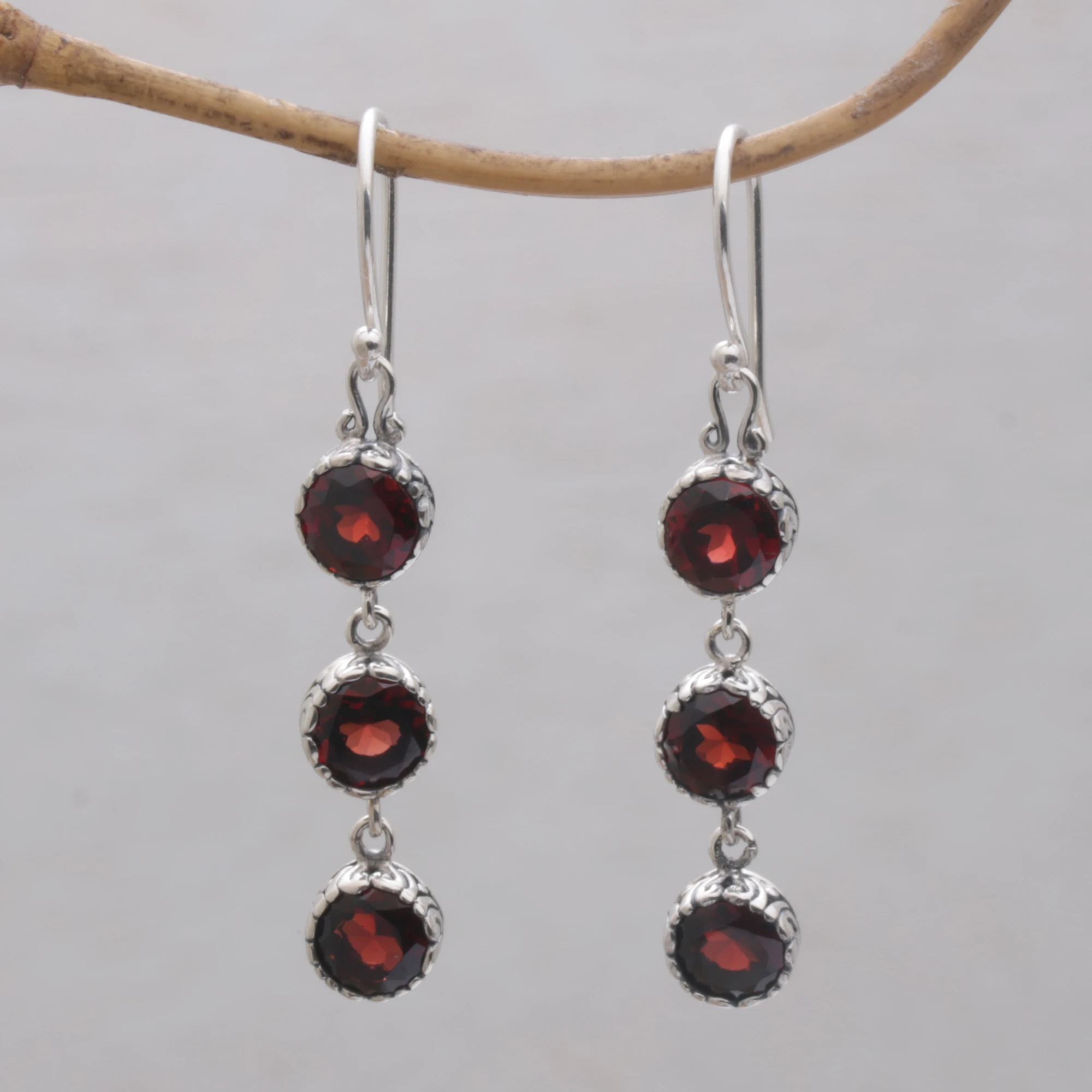 Over three carats of gorgeous faceted garnet gemstones sparkle in this lovely pair of dangle earrings presented by Komang Wijayana of Bali. He works with local artisans who craft each earring from sterling silver, with a trio of round garnet stones dangling elegantly below one another in bezel settings. An oxidization technique is used to enhance the swirling motifs seen on the sides of the earrings, accentuating their natural beauty.