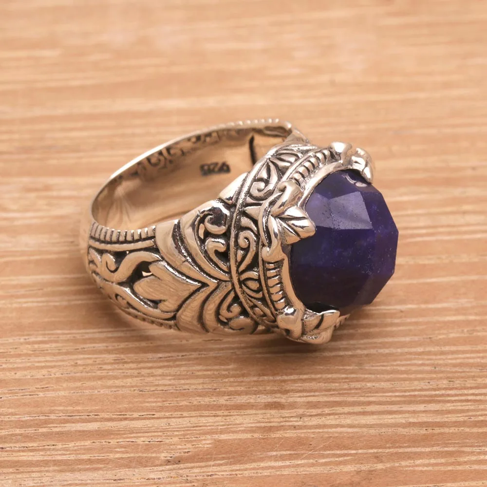 Handmade Balinese Sapphire and Sterling Silver Cocktail Ring, 'Regal Serenity'
