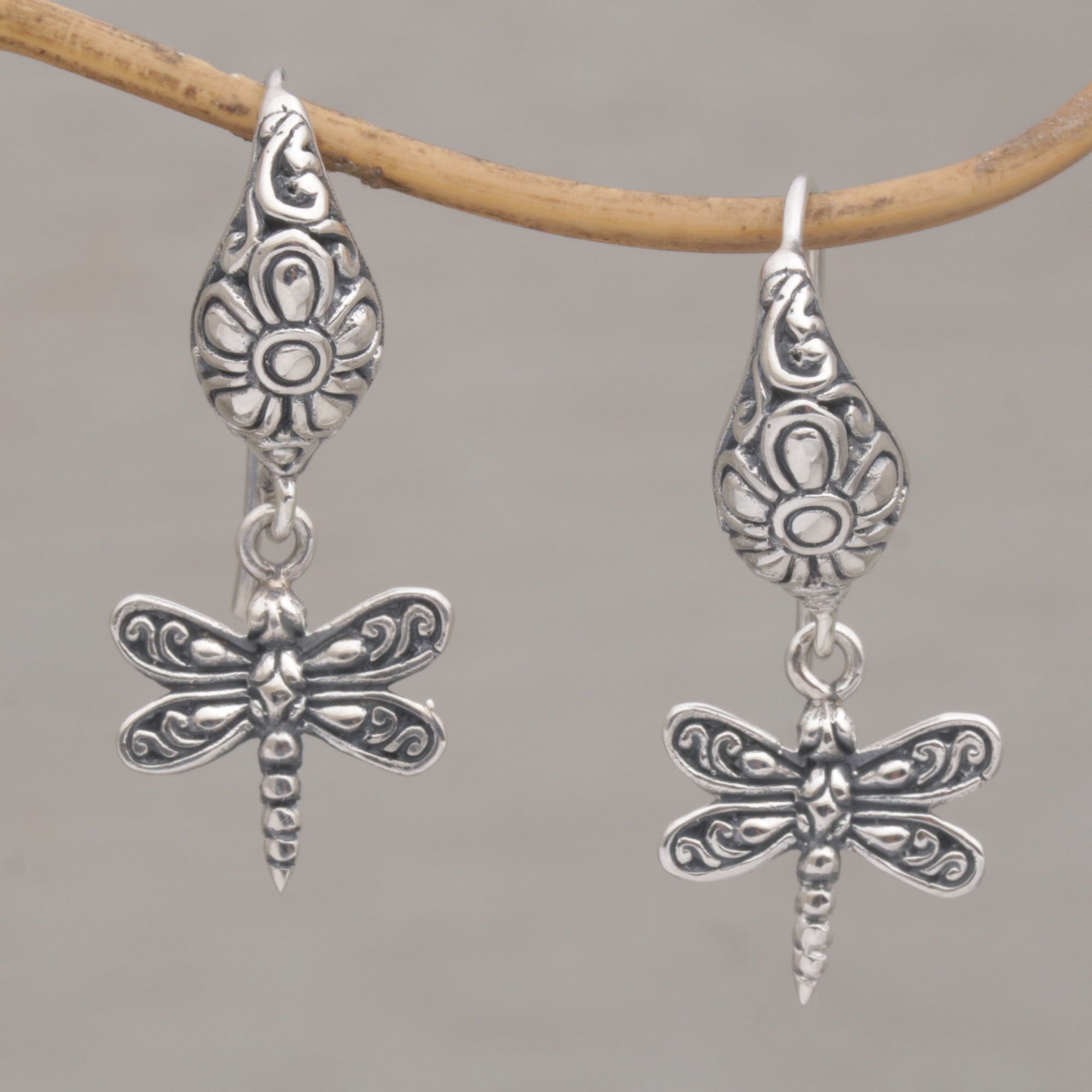 A beautiful dragonfly sways gently beneath a floral motif in these delightful pair of earrings by Balinese artisan Suar Dwipayana. Handcrafted from sterling silver, these eye-catching dangle earrings are perfect for casual wear.