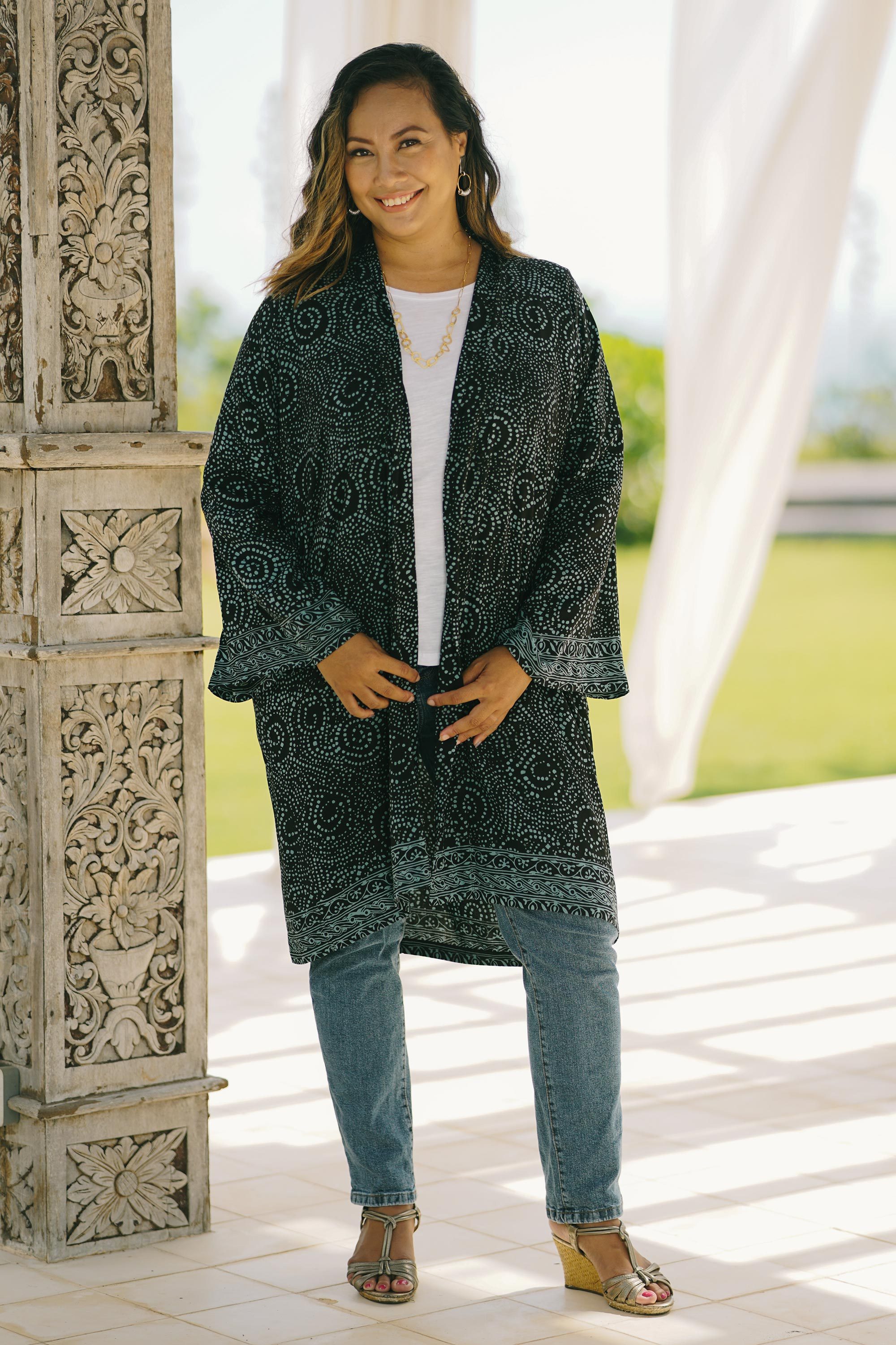 This elegant robe designed by Balinese artisan Saktut Raitawati is a practical and stylish alternative to a dressing gown or bathrobe. Crafted from fine rayon and featuring a swirling light azure motif stamped on a coal black background, the robe comes with a matching waist belt and includes one pocket on each side.