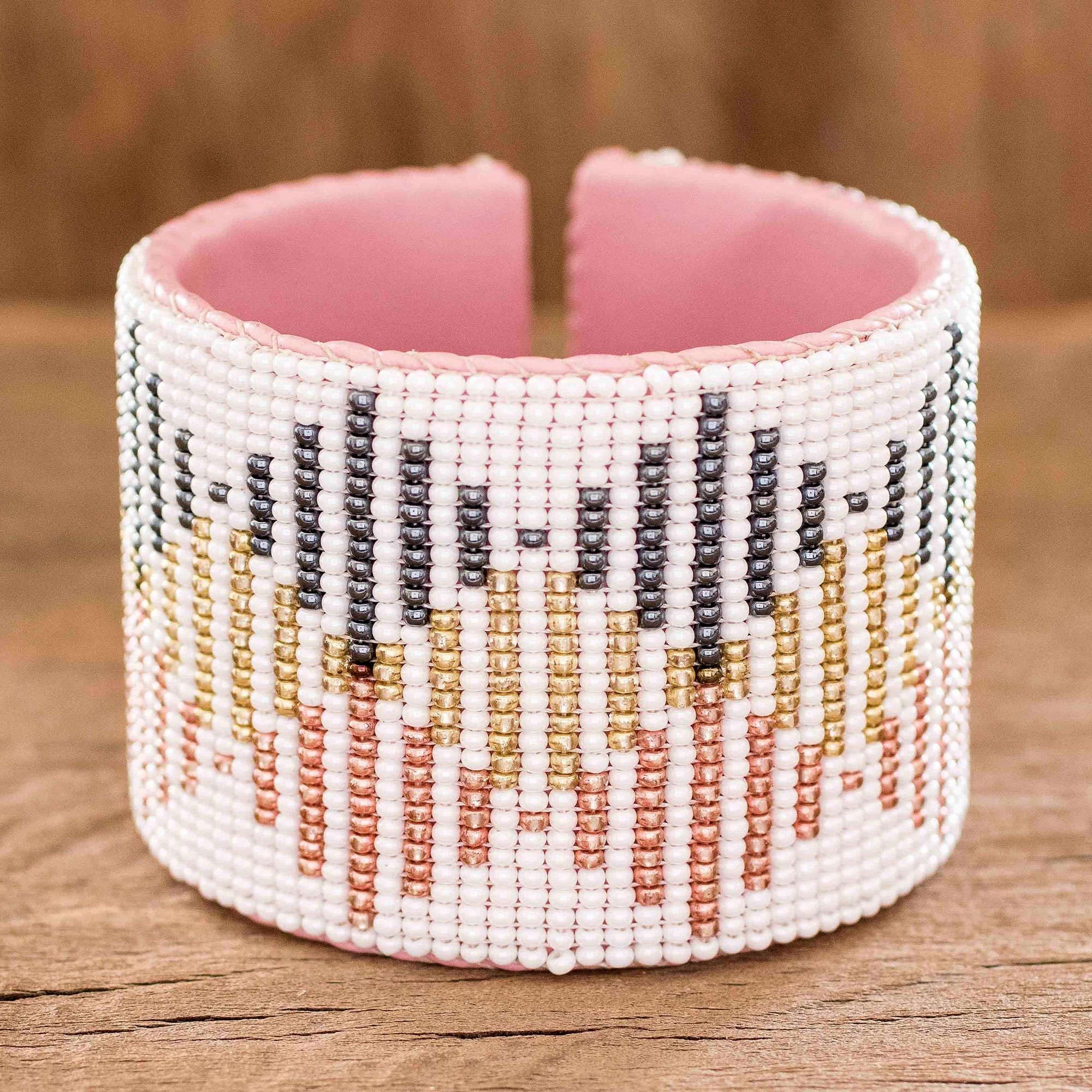 This gorgeous cuff bracelet is from the Santiago Atitlan Women's Group in Guatemala, who create beaded jewelry to generate sustainable income and promote self-sufficiency. The wide cuff is made from supple pink leather and decorated with tiny glass beads in white, pink, titanium and gold.
