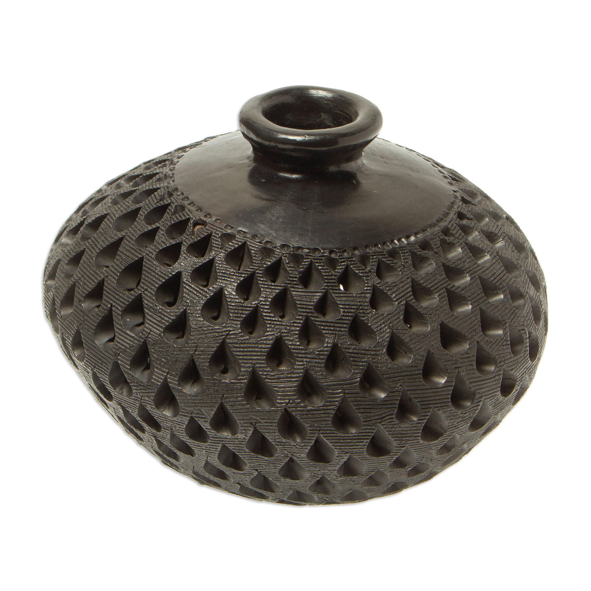 Fernando and Magali Pedro in Mexico work in the Oaxacan art form known as barro negro or "black clay" to craft this unique decorative ceramic vase. The distinctive black color and slightly metallic sheen are created by polishing the clay's surface with a quartz stone before the piece is fired in the kiln.