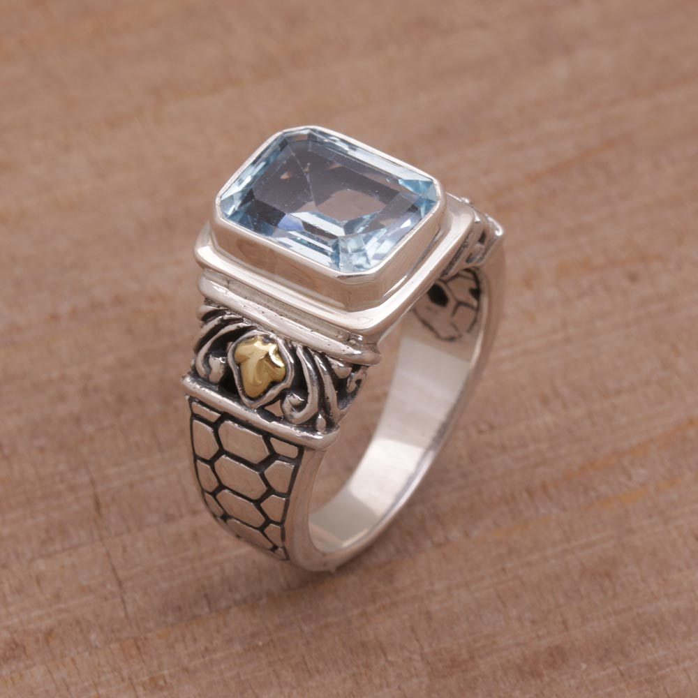 Kadek Wijanegara handcrafts this bold, beautiful single-stone ring. Crowned with dazzling blue topaz, the engraved band is made from sterling silver with 18k gold-plated accents. The blue topaz weighs four carats.