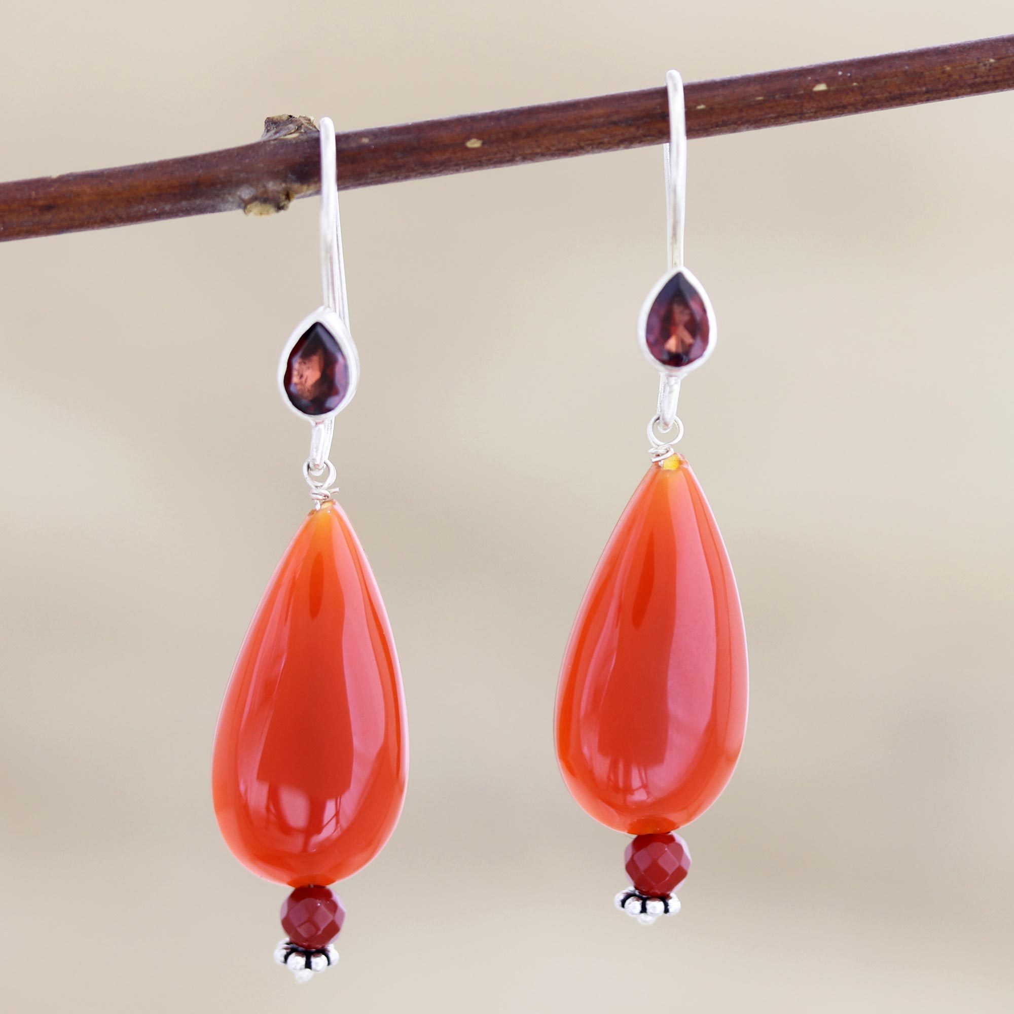 Handmade Carnelian and Garnet Dangle Earrings from India, 'Fan the Flame'