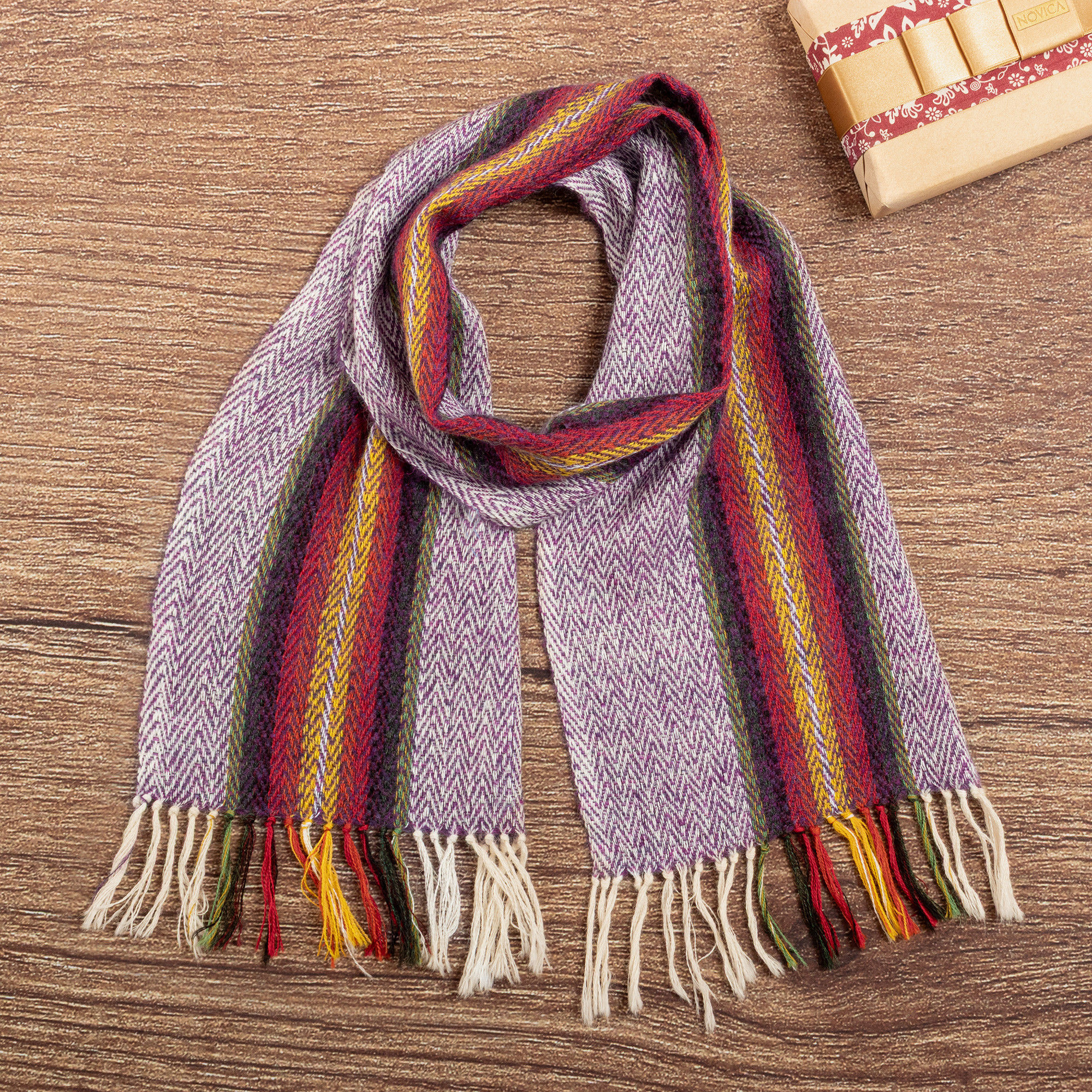 Plum and white hues unite to let you move to the rhythm of a chic tune. Peru's Ulloa Family showcases the region's textile artistry in this soft alpaca scarf, combining chevron and striped patterns. Accented with the fringes, the center lines crown the piece with a palette of goldenrod, ginger, green and crimson colors.