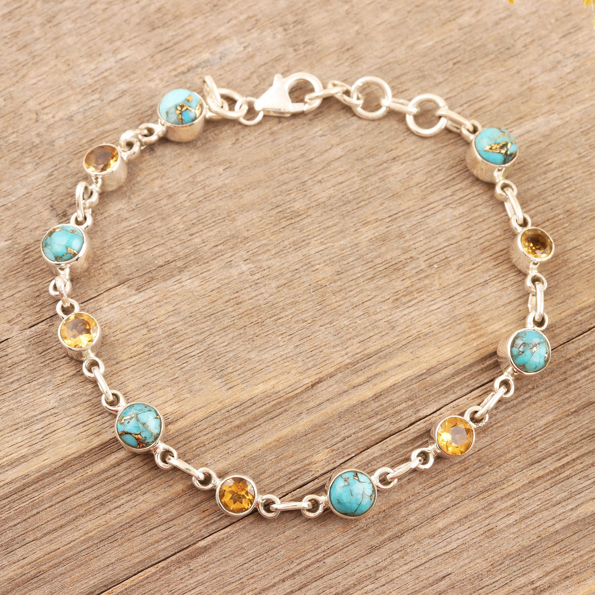Add a touch of understated elegance to your outfit with this ravishing link bracelet from India's Shanker. Linked by shining sterling silver, six globes of composite turquoise alternate with five faceted citrine gemstones in bezel settings. The bracelet fastens with an adjustable lobster claw clasp in sterling silver.