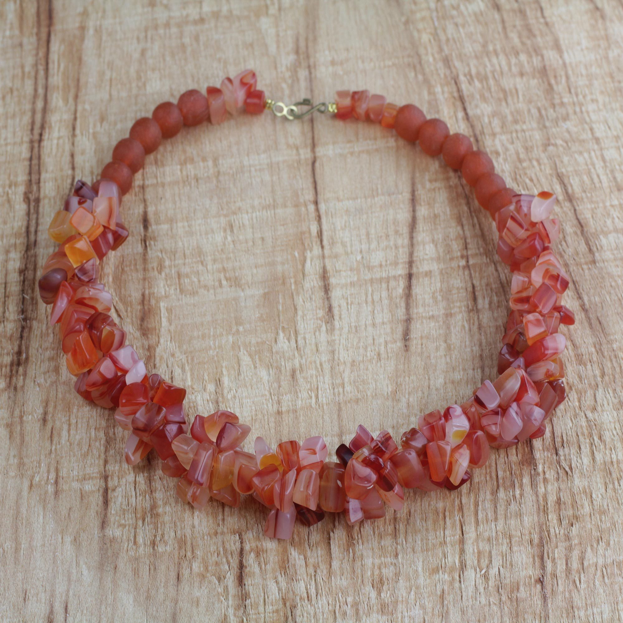 Harriet Faako Adjei creates this beautiful beaded necklace from agate chips and recycled glass beads. Crafted by hand in Ghana, the necklace features dozens of dainty agate chips in warm shades of coral red adorning the front. Recycled glass beads decorate the back of the necklace, completing the delightful design.