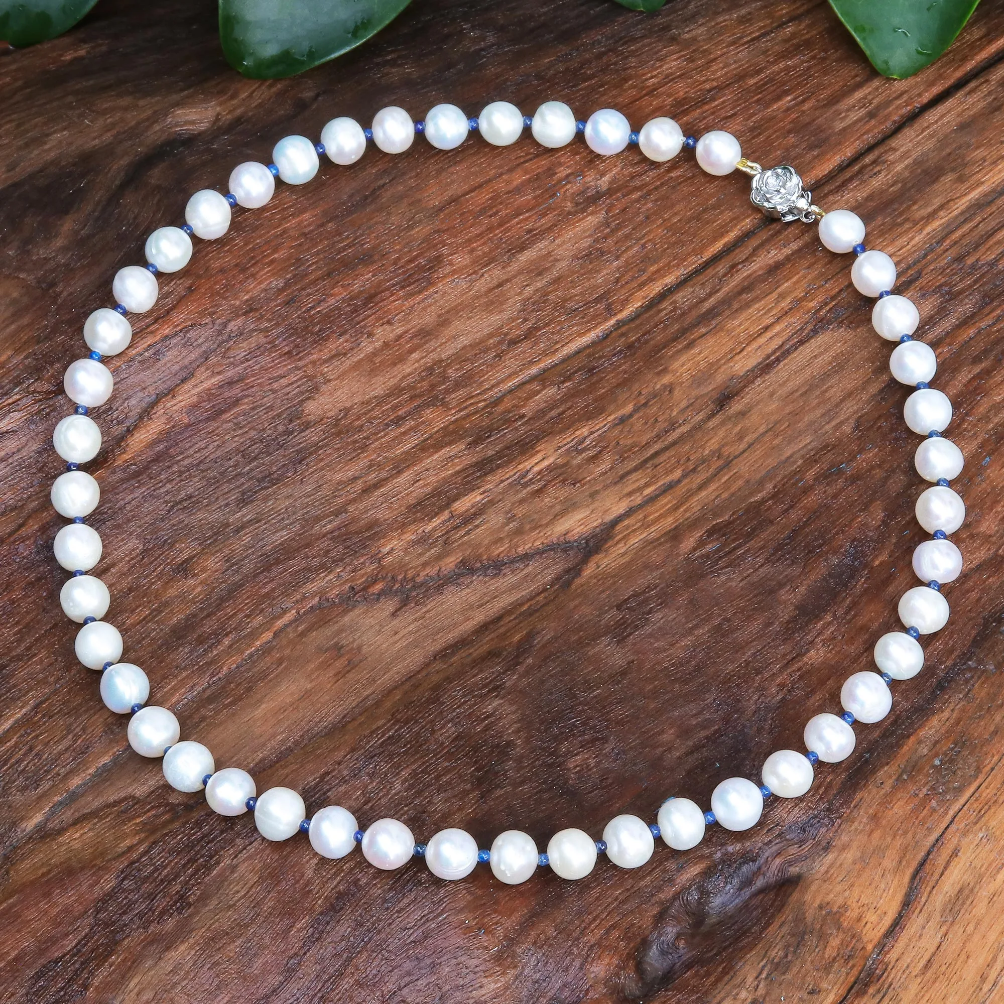 Nothing says prim and proper like an elegant strand of naturally white pearls. Thai artisan Matta alternates cultured freshwater pearls alongside petite lapis lazuli gemstones to create the necklace, while a rose-shaped sterling silver box clasp adds an extra touch of loveliness.