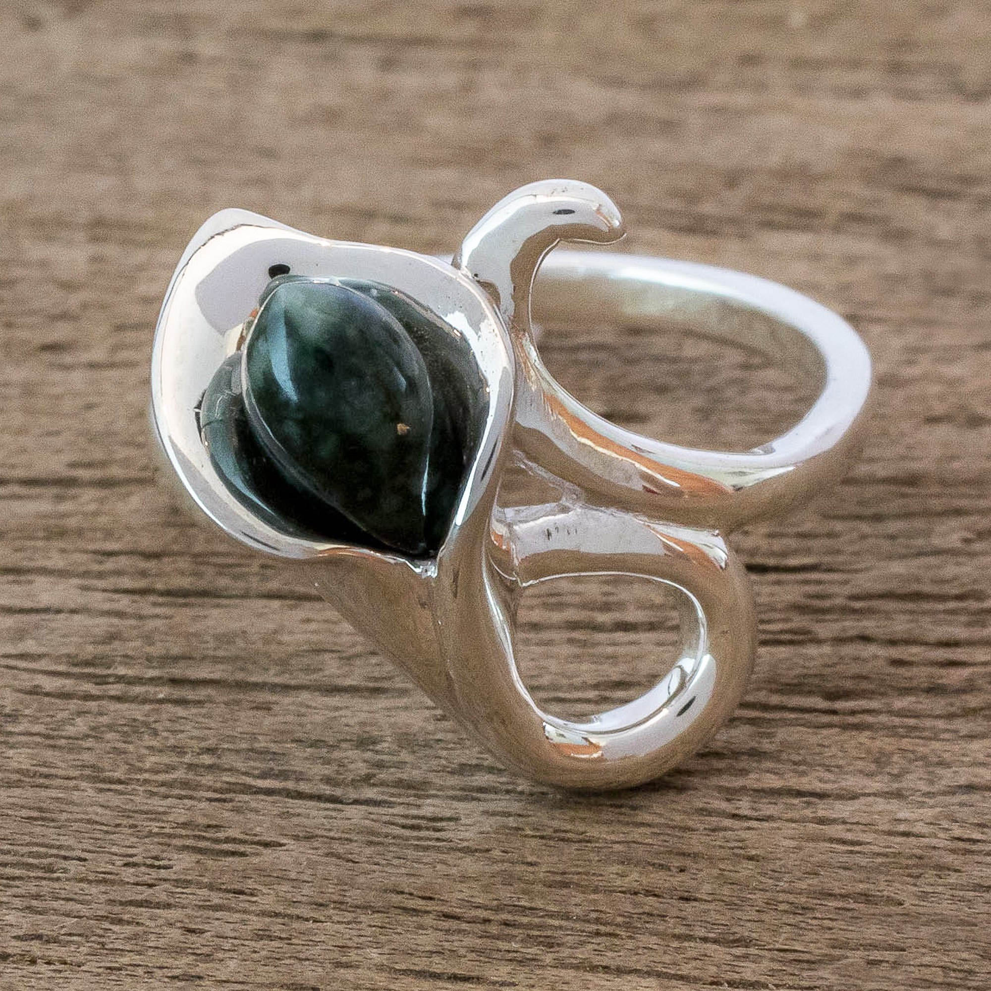 Handmade Dark Green Jade and Silver Cocktail Ring, 'Mixco Lily in Dark Green'