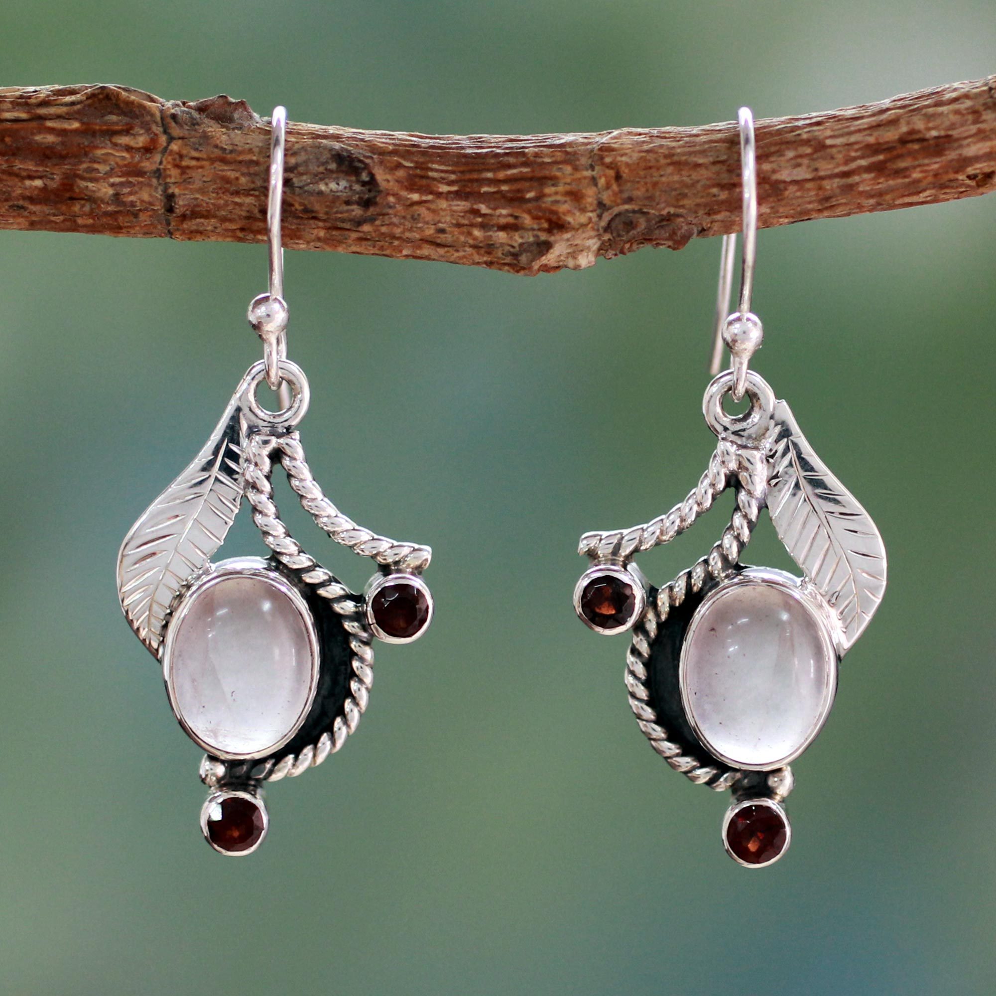 Handmade Earrings Rose Quartz and Garnet from India, 'Dew Blossom'