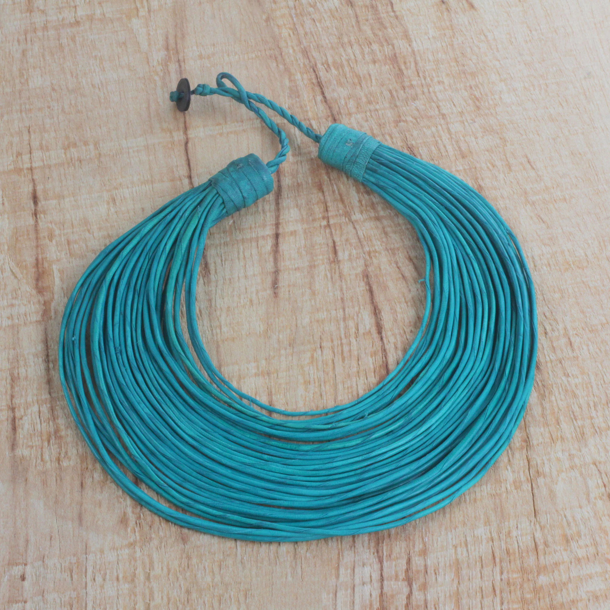 Ila Suleyman of Ghana presents this bold statement necklace. Crafted from 40 strands of leather in emerald and featuring a button loop clasp, the artist names this pogyende, a Northern Ghanaian word meaning "one lovely sister".