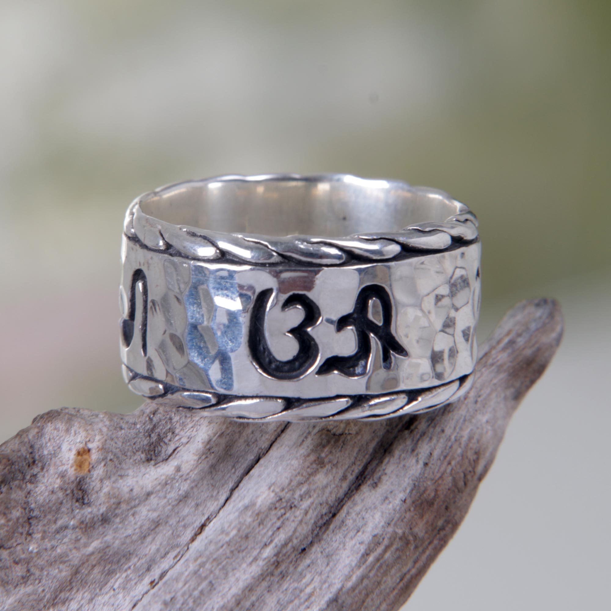 This unique silver ring from Balinese artisan Nyoman Ariawan showcases handcrafted details. The wide, hammered sterling silver band is engraved with the baksara or ancient letters Sa Ba Ta A, which represent the four cardinal directions of East, South, West and North. Rope-like edges and oxidized contrasts make this ring a standout.