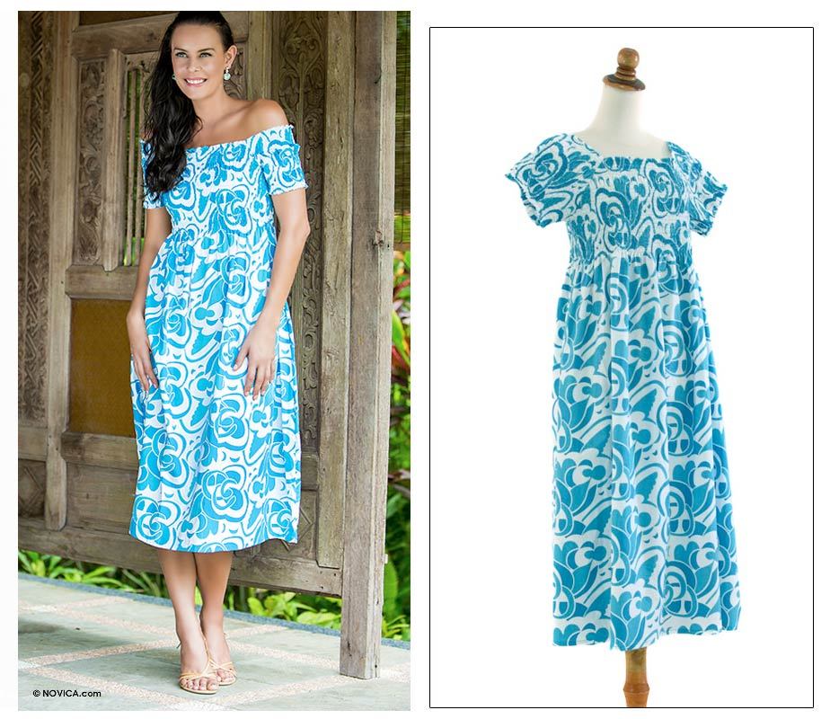 Cool casual comfort distinguishes this design by Hari and Arthur. With a squared neckline and short sleeves, the dress features elasticized smocking in the bodice for easy fit. The blue on white motifs evoke the Balinese sky; they are created with the silkscreen technique.