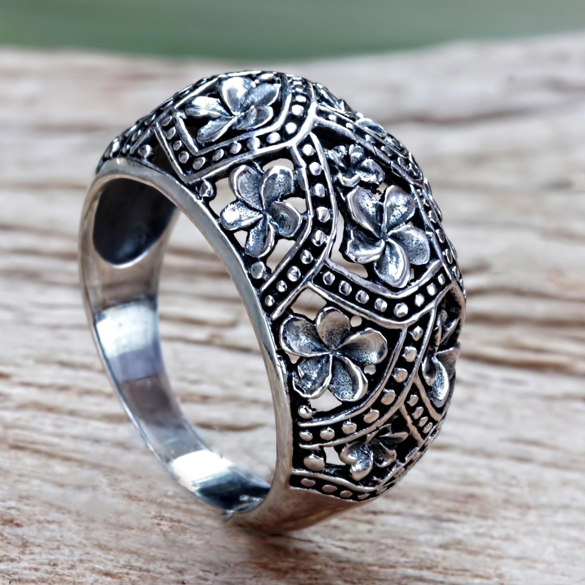 Said to be ruled by Venus and symbolize femininity, frangipanis are associated with Buddha. Known as the Balinese flower, frangipanis crown this fabulous ring by Kenari. The sterling silver handcrafted ring features delicate openwork on the front and an oxidized finish.