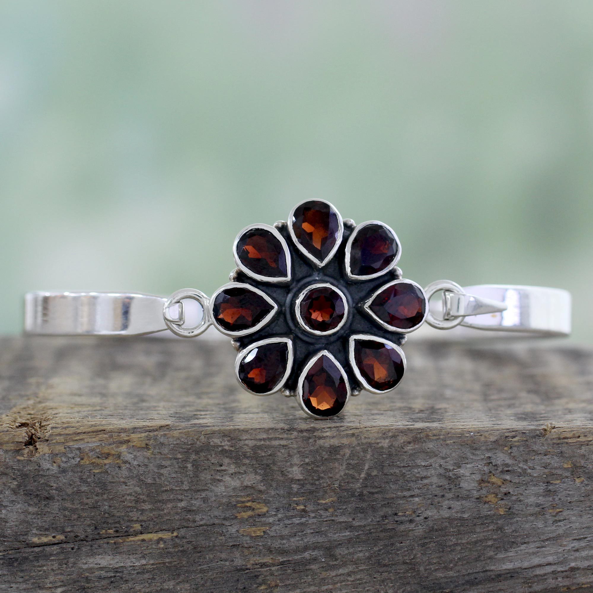 Shimmering and glistening gemstones of garnet totaling six carats form the petals of this radiant flower presented on a sterling silver bangle. Neeru Goel of India presents this floral-themed bangle with a small fishhook clasp for ease of wearing.