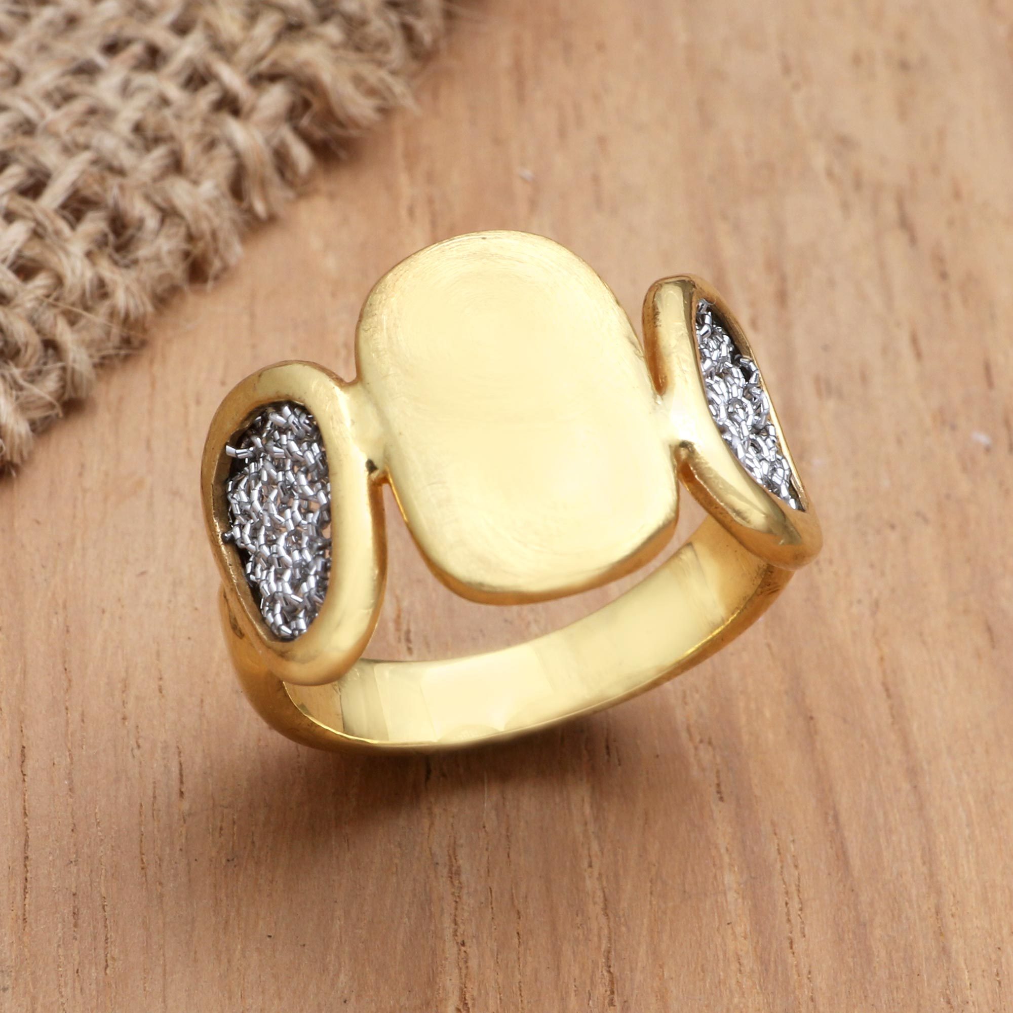 Handmade Gold-Plated Brass and Mesh Band Ring, 'Golden Eye'