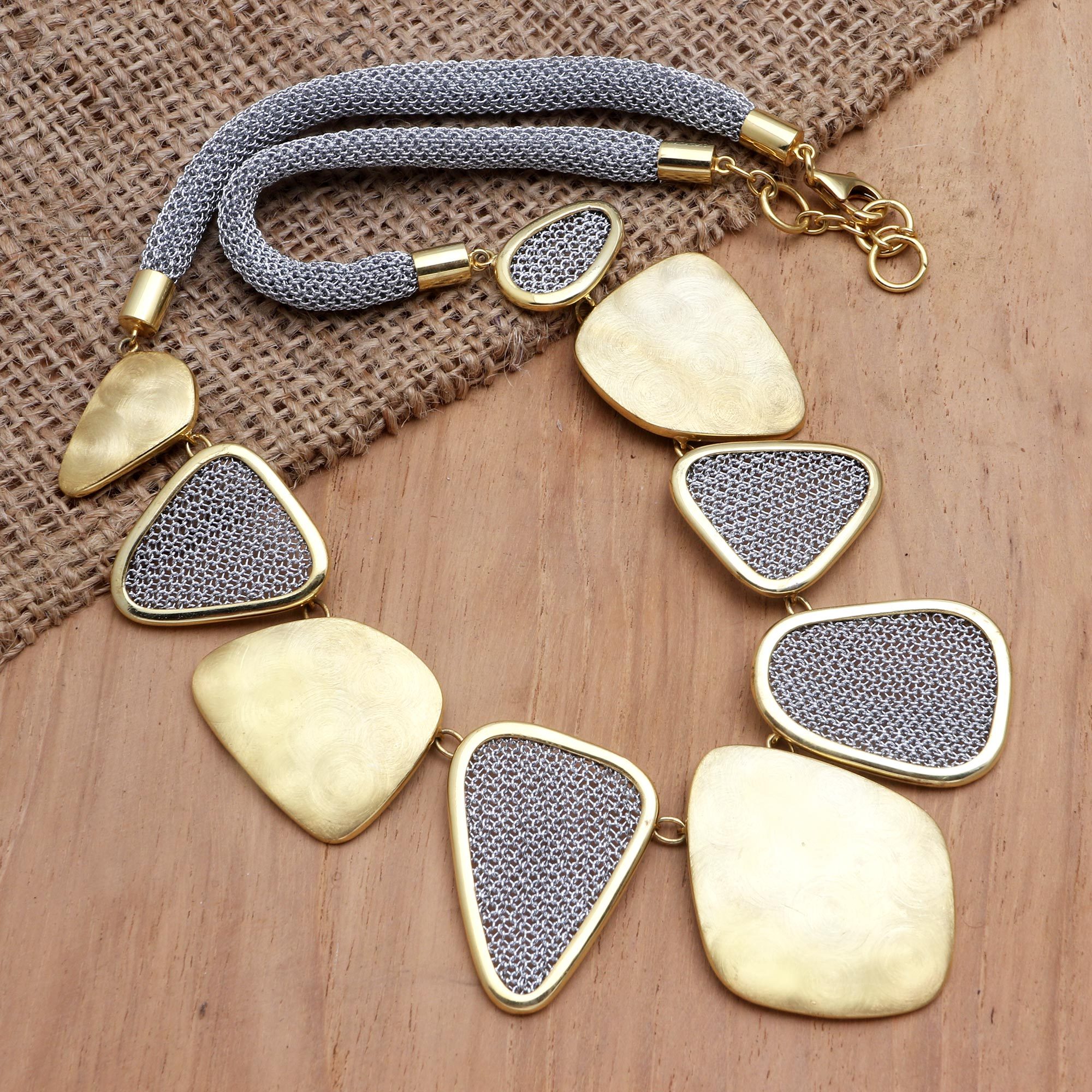 A shining gold pendant centers this elegant necklace designed by Ayu Widiani and crafted by Balinese artisans. Connected by tiny links, 18k gold-plated brass shapes alternate with fine polyester mesh shapes framed in gold-plated brass. A mesh strand fastens with a lobster claw clasp and finishes the necklace.