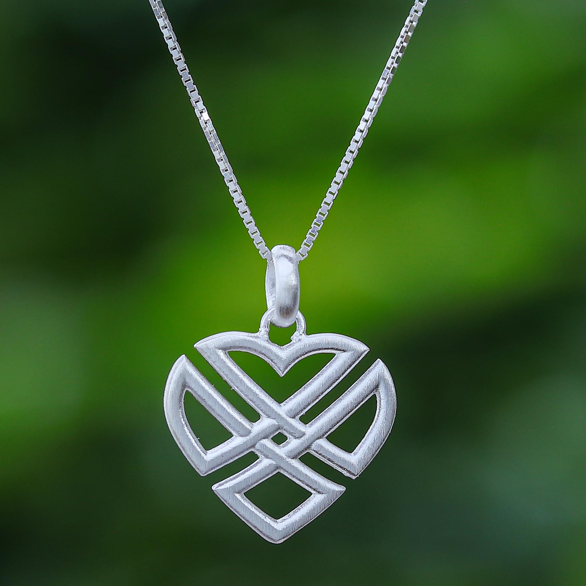 A crossed heart shape formed in Celtic style is depicted in this enticing sterling silver necklace. Crafted by Thai artisan Sarote Lochotinunt, the pendant receives an elegant brushed-satin finish and hangs from a unique, Venetian-style box chain.