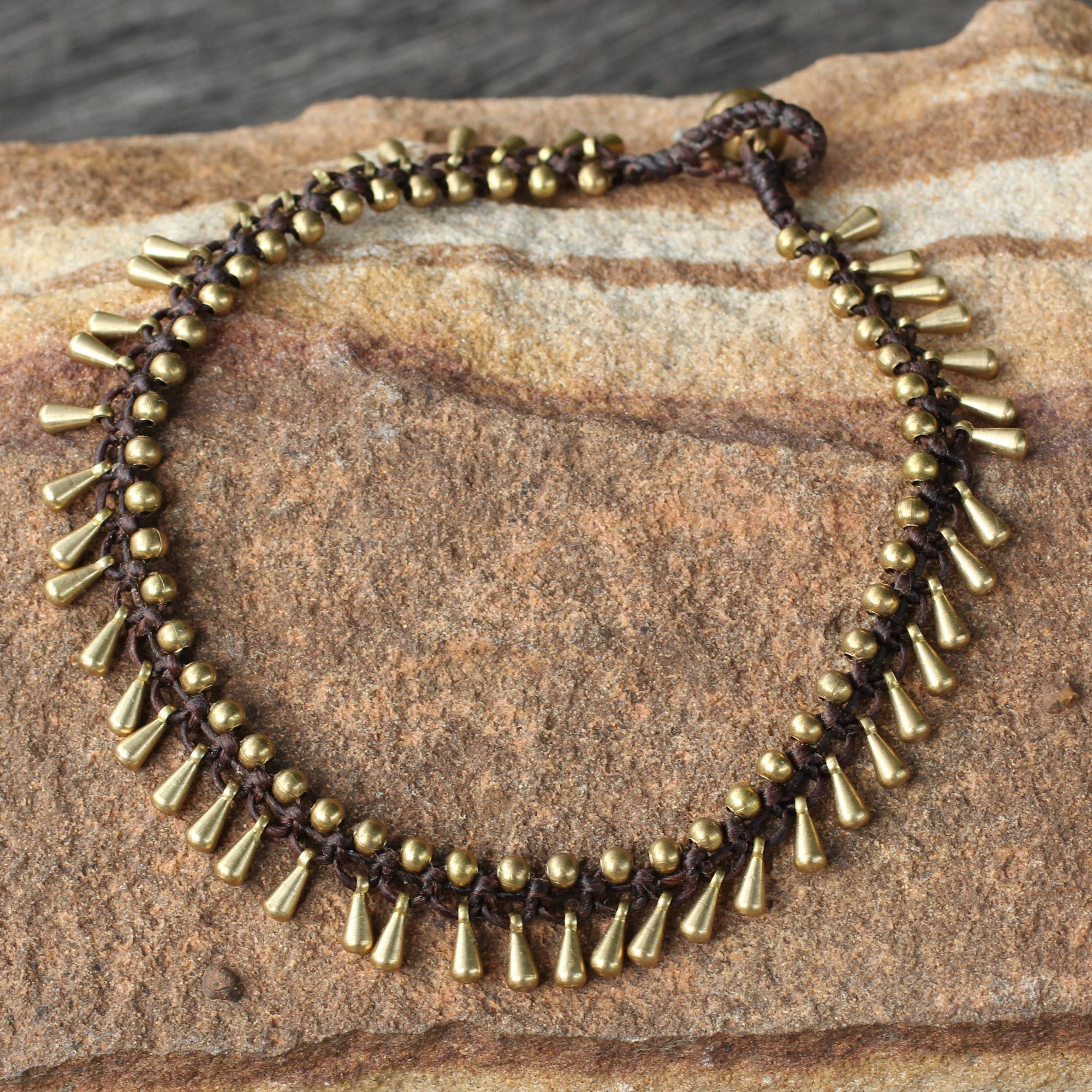 The brass beads and charms on this anklet resound with the jewelry traditions of Thailand. Tiraphan Hasub designs this flirty anklet, which she crafts by hand with rich brown cords. The anklet fastens with a non-ringing brass bell.