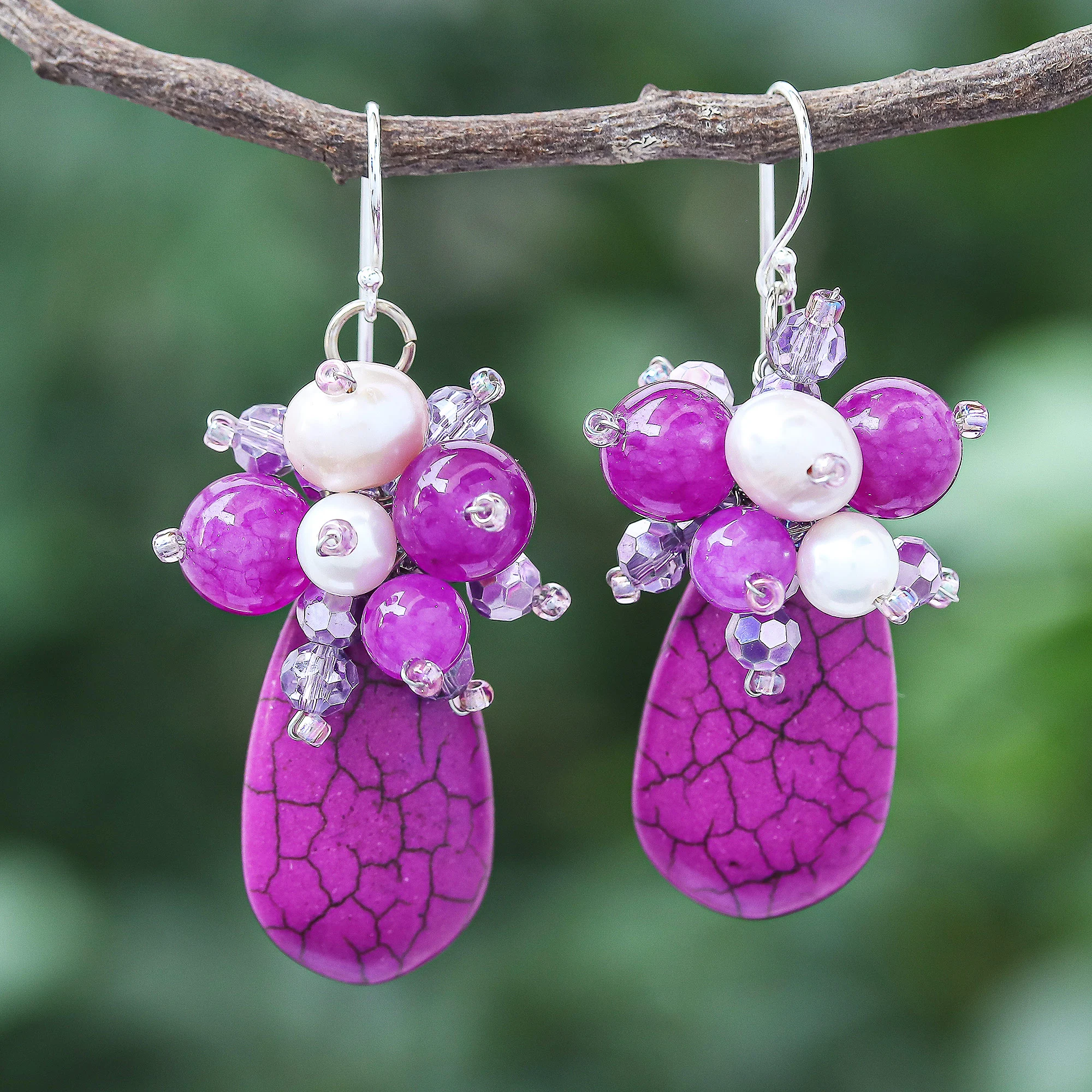 A long fuchsia howlite gemstone drops beneath a cluster of colorful beads in this funky pair of dangle earrings from Thailand's Nareerat. The artisan hand threads quartz and cultured pearls alongside fuchsia glass beads to create the earrings, then finishes the pair with shining sterling silver hooks.
