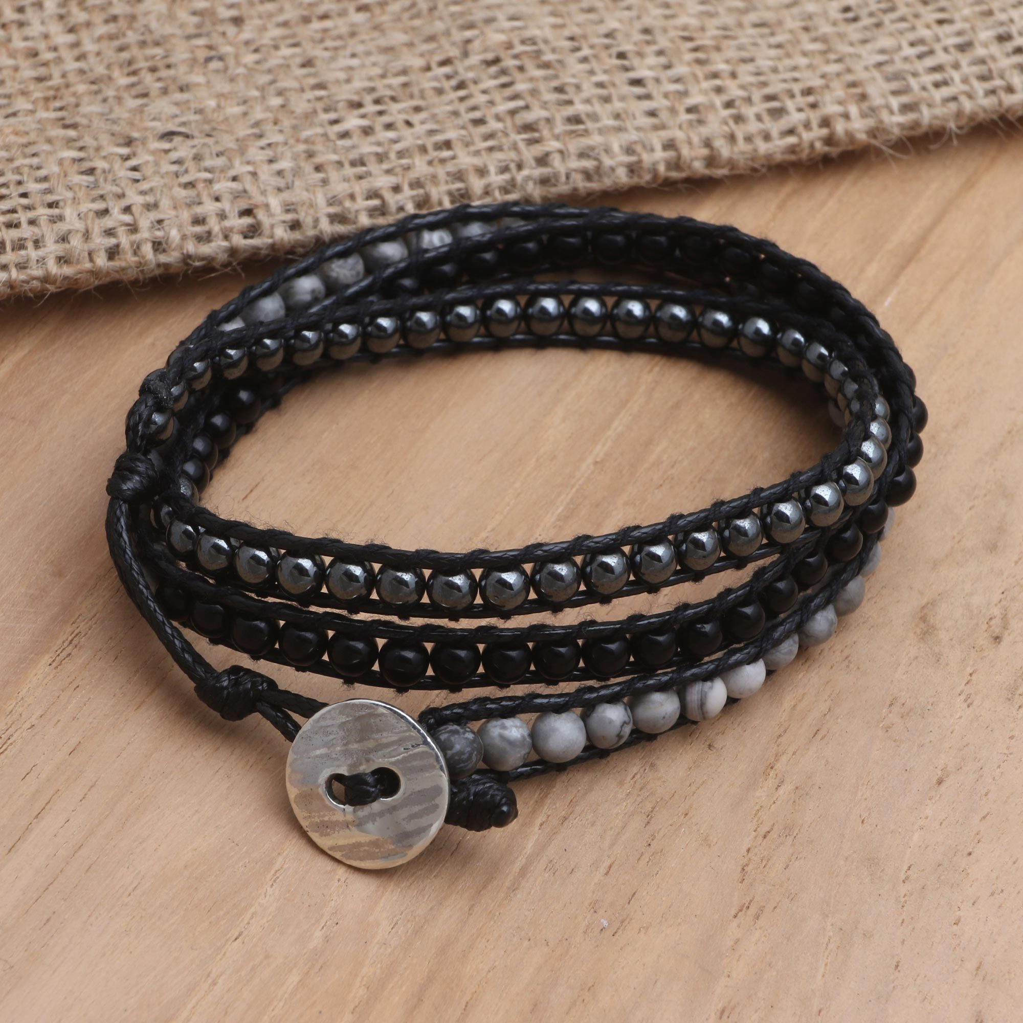 Handmade Jasper and Onyx Wrap Bracelet, 'Grey Day'