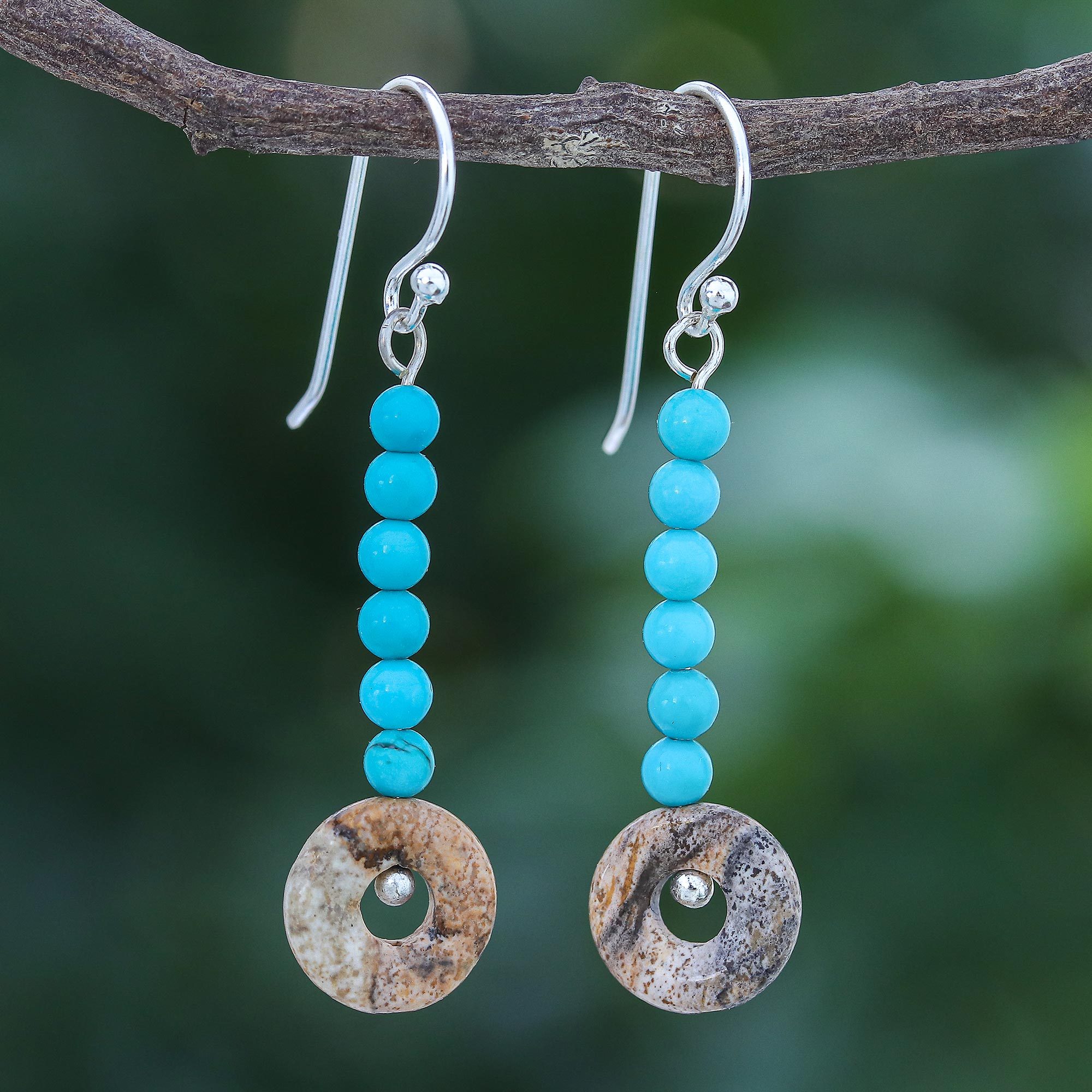 Add some fun to your wardrobe with these pretty dangle earrings designed and crafted by Thailand's Srimuang. A hollow jasper ring dangles from the end of a long row of reconstituted turquoise beads, while a tiny sterling silver bead hangs in the ring's hollow.