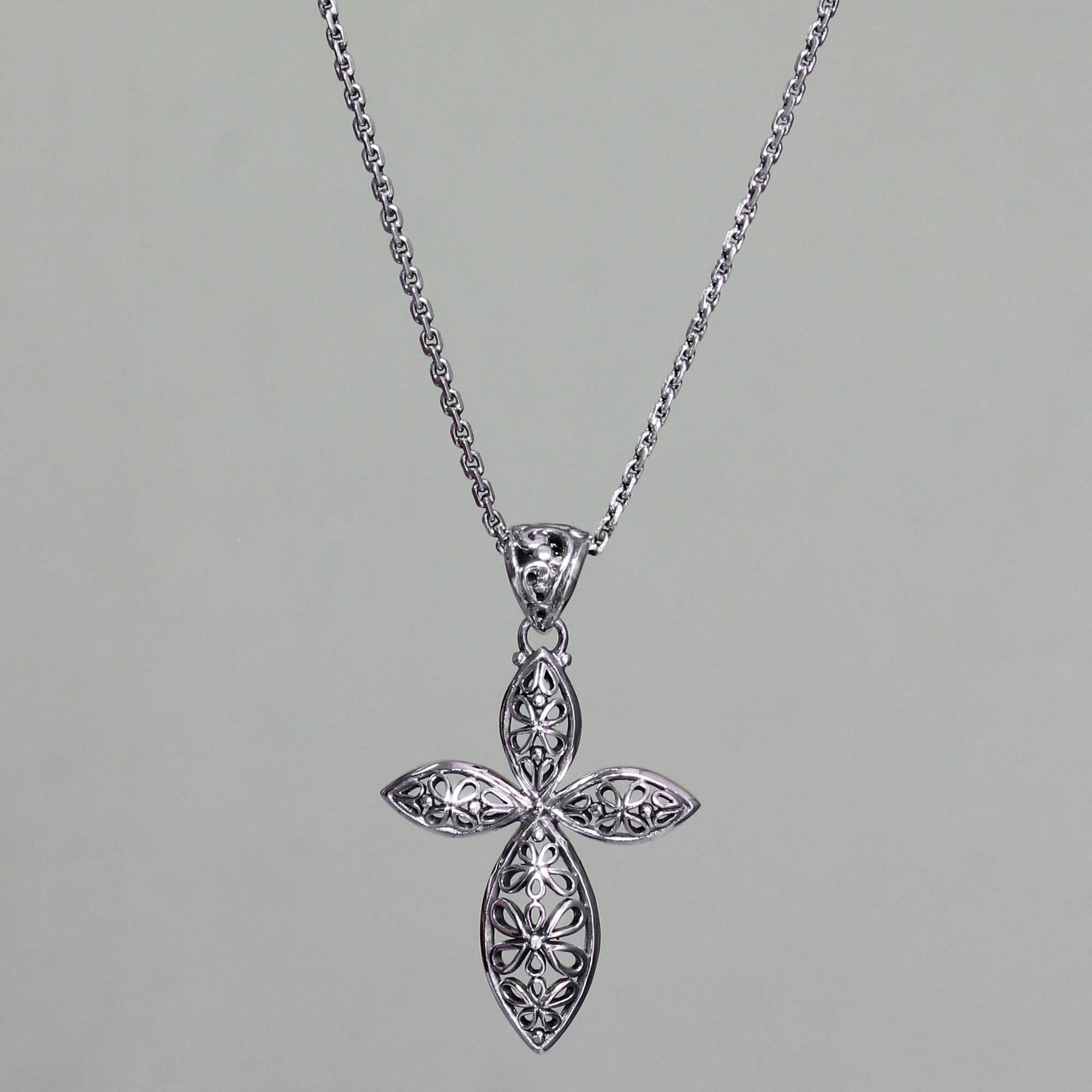 Classic Javanese batik patterns inspire this beautiful cross necklace. Yuniati selects the kawung, an eight-pointed rosette once reserved for the sultan, interpreted in sterling silver. These motifs once adorned men's formal clothing during the ancient Javanese kingdom and symbolize dignity, self-respect and self-esteem.