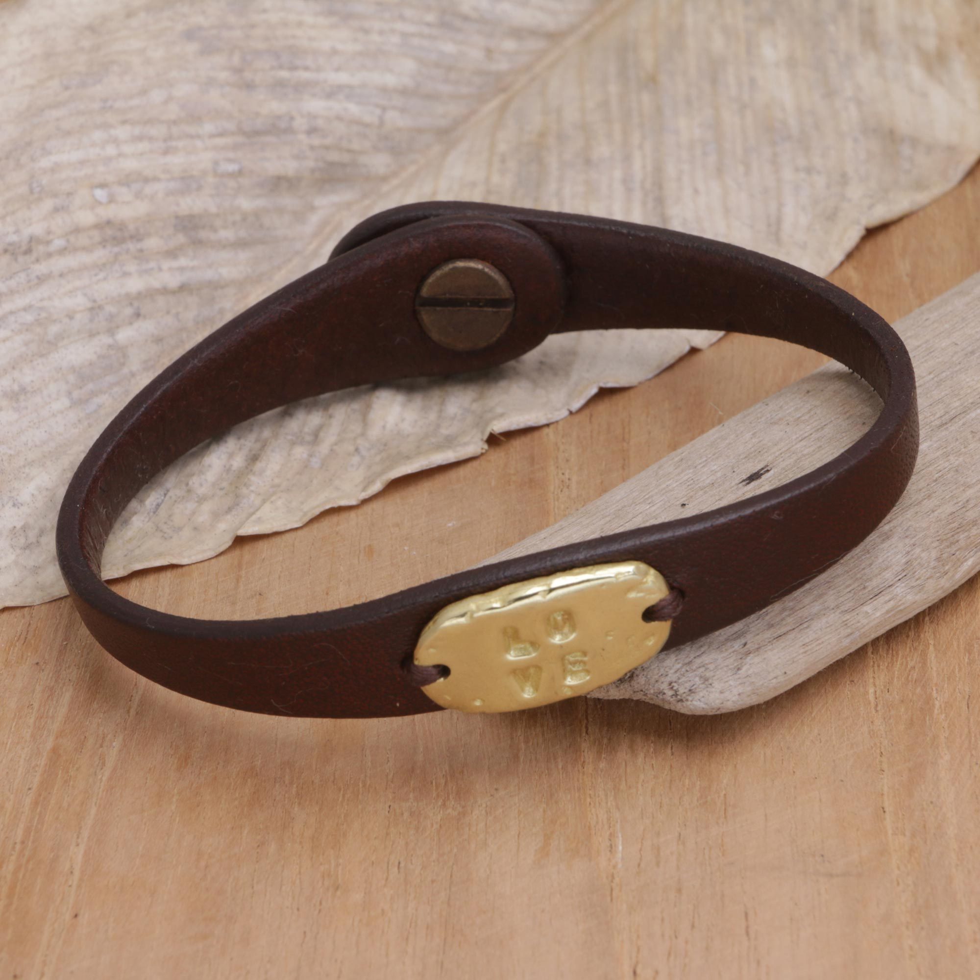 Love glistens with golden light, celebrating the power of this most valued of emotions. Hariyono engraves the word on an 18k gold plated brass plaque with a hammered finish. It centers the exquisite design of this handcrafted leather wristband bracelet.