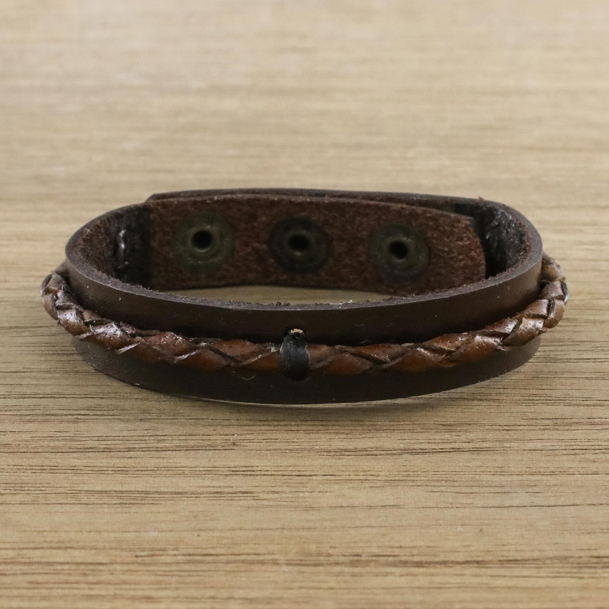 Using leather in a brown color, Thai artisans handcraft this wristband bracelet. A strip of leather circles the wrist, accentuated by a braided cord on the outside. Chaloemphon presents this accessory, featuring an adjustable length.
