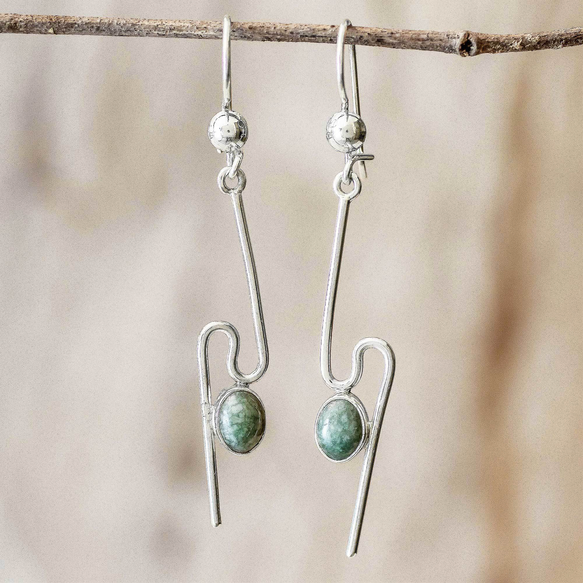 Natural light green Guatemalan jade is showcased in these contemporary dangle earrings from artisan Zandra Lorena Sajbin. The gems are bezel-set to accent switchback curves crafted from sterling silver wire. The earrings swing from sterling silver kidney earwires.