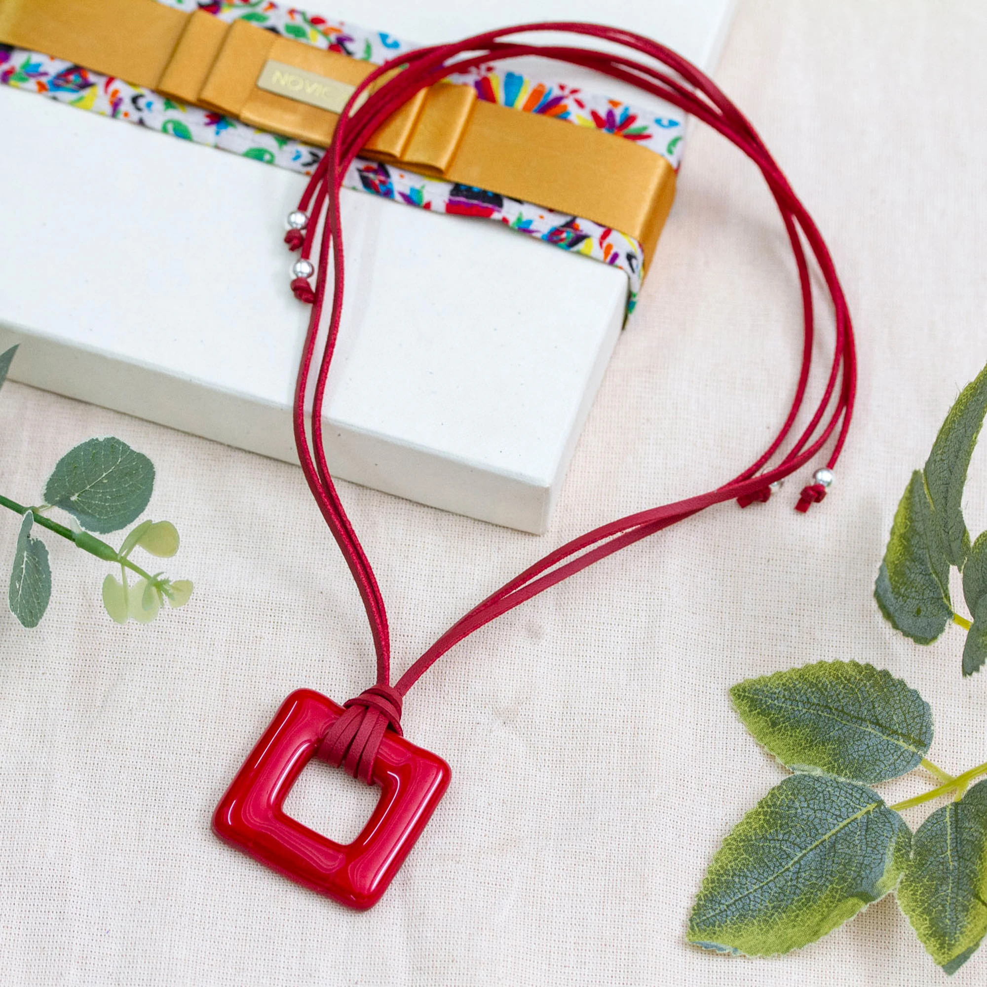 With its rich crimson fused glass square pendant, this eye-catching necklace brings a fresh, modern twist to any outfit. The sleek pendant handcrafted by Fabiola Quevedo shimmers with artistic flair, complemented by a chic suede cord with sterling silver accents. The adjustable tie closure lets you wear it at the length that suits your style.