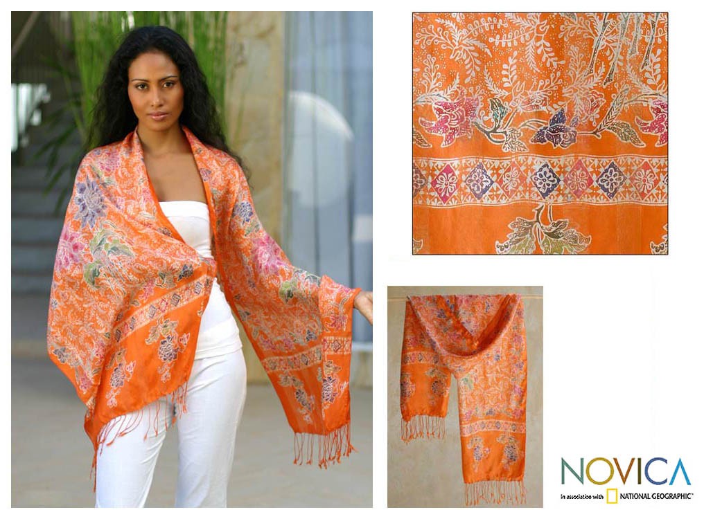 Colorful chrysanthemums cover a radiant shawl of orange silk. Working with traditional batik techniques, Yuni Kristina creates a wrap of graceful femininity.
