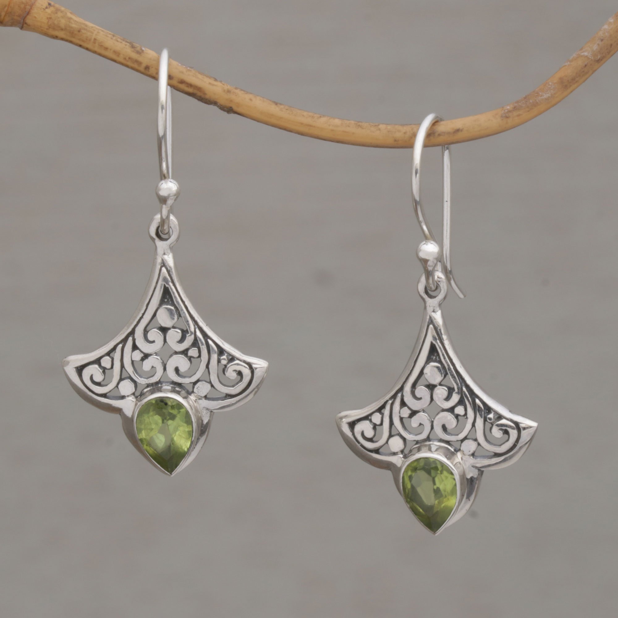 With their beautifully unique design and intricately cut motif, this pair of 925 sterling silver earrings is truly eye-catching. Indonesian artisan Suar Dwipayana designs and creates each pair of earrings with an oxidized and polished finish and adorns the bottom peak of the earrings with green peridot faceted gemstones that total one carat.