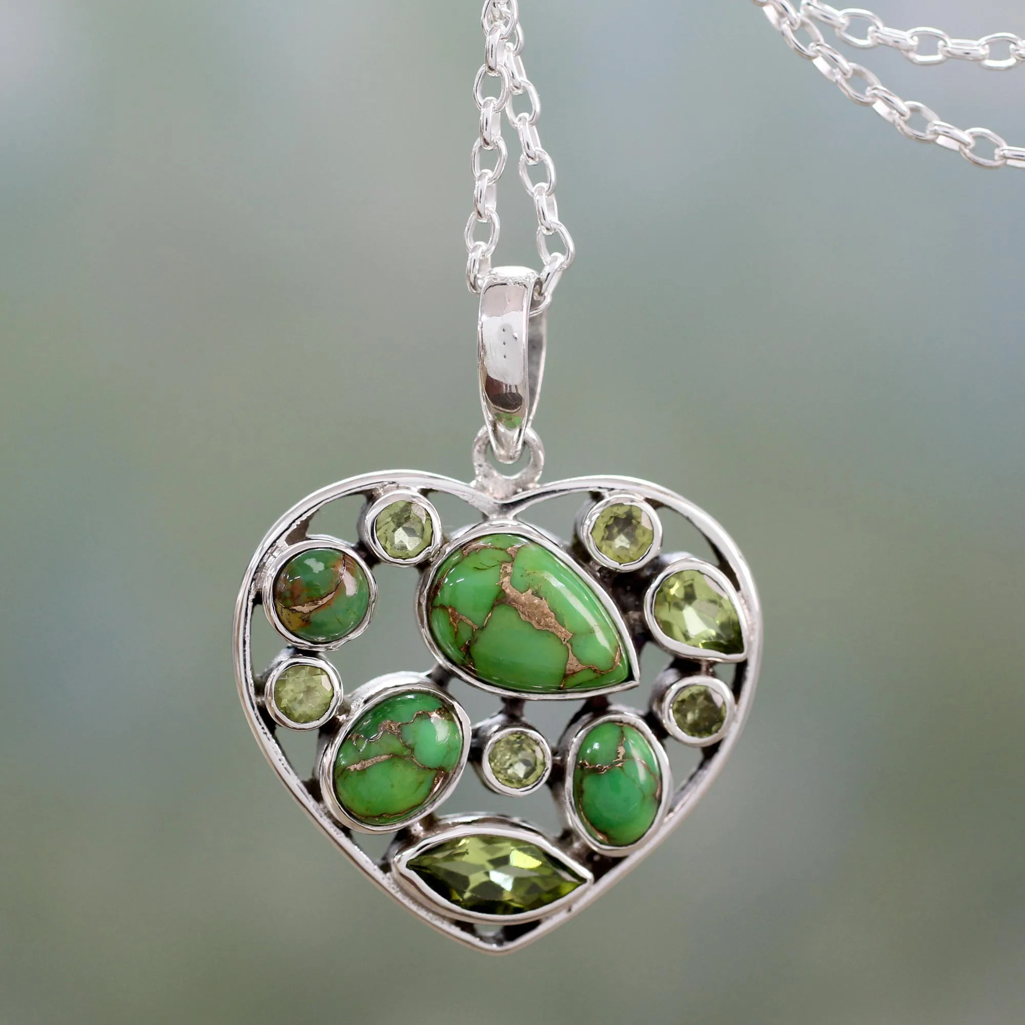Three magnificent carats of natural peridot glow alongside green reconstituted turquoise in this chic pendant necklace. Neeru Goel of India presents these green gemstones meticulously arranged within a sterling silver heart pendant.