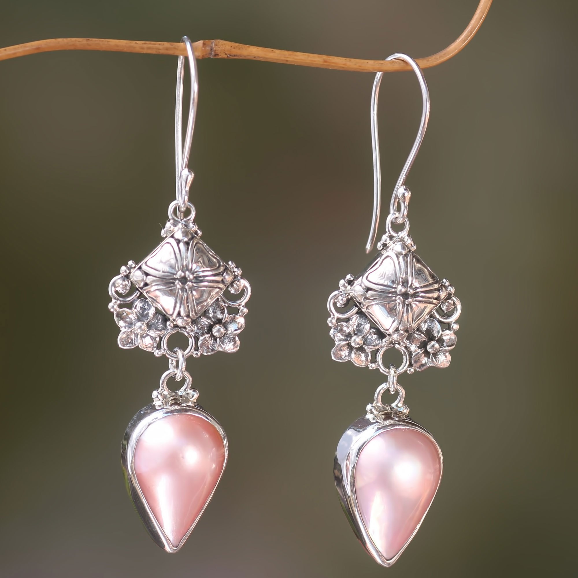 Like creamy pink buds, natural cultured mabe pearls dangle from these earrings presented by artisan Buana of Bali. The sterling silver earrings feature heart and frangipani flower motifs for a look that is truly romantic.