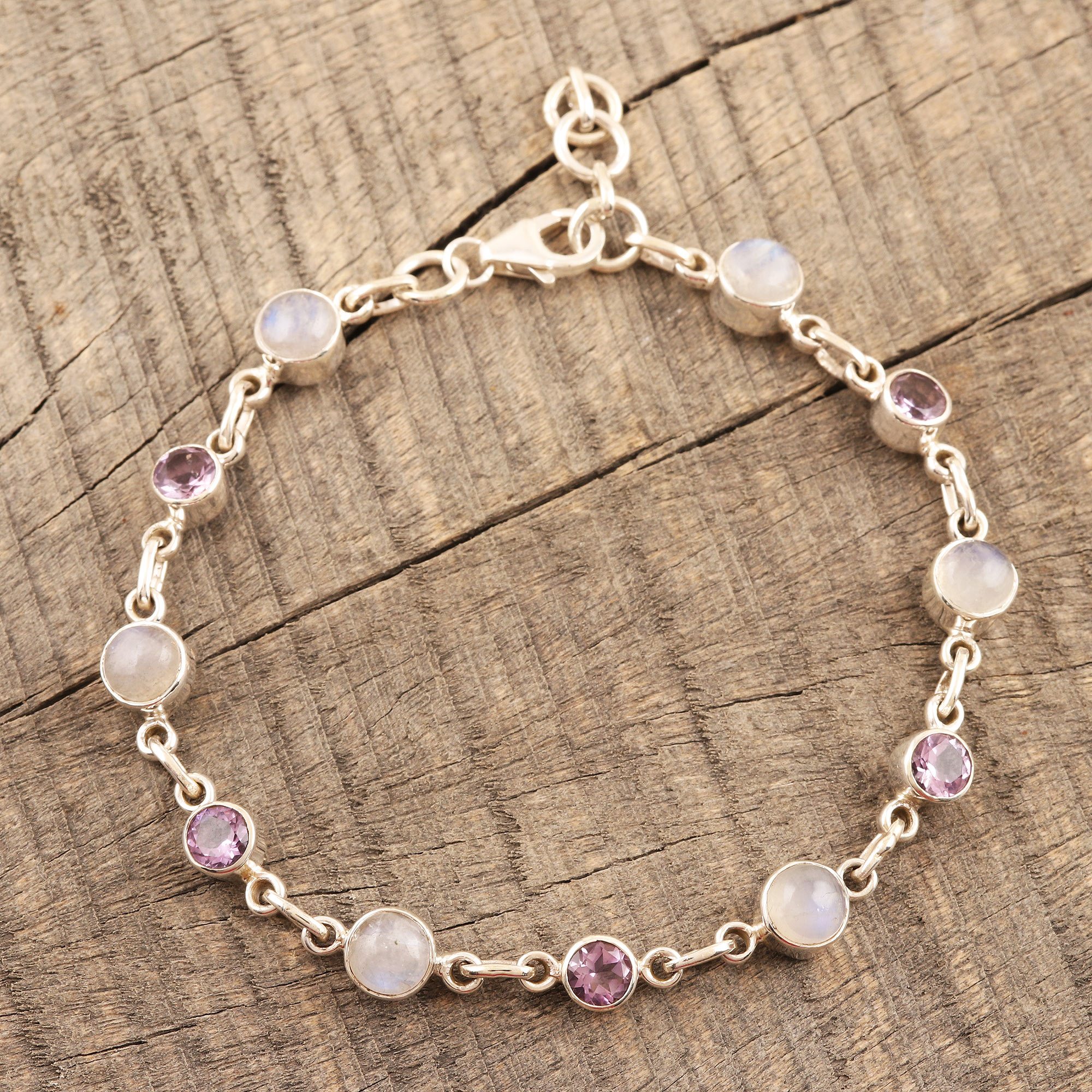 Add a touch of understated elegance to your outfit with this ravishing link bracelet from India's Shanker. Linked by shining sterling silver, six rainbow moonstone globes alternate with five faceted amethyst gemstones in bezel settings. The bracelet fastens with an adjustable lobster claw clasp in sterling silver.